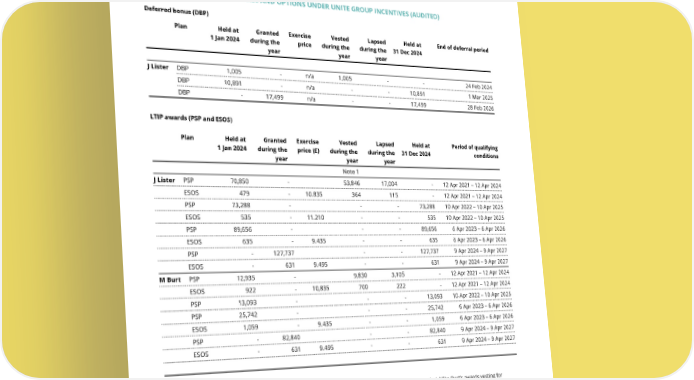 THE UNITE GROUP PLC Annual Report and Accounts 2024 136 DIRECTORS’ INTERESTS IN SHARES AND OPTIONS UNDER UNITE GROUP INCENTIVES (AUDITED) Deferred bonus (DBP) LTIP awards (PSP and ESOS) Plan Held at 1 Jan 2024 Granted during the year Exercise price Vested during the year Lapsed during the year Held at 31 Dec 2024 End of deferral period J Lister DBP 1,005 - n/a 1,005 - - 24 Feb 2024 DBP 10,891 - n/a - - 10,891 1 Mar 2025 DBP - 17,499 n/a - - 17,499 28 Feb 2026 Plan Held at 1 Jan 2024 Granted during the year Exercise price (£) Vested during the year Lapsed during the year Held at 31 Dec 2024 Period of qualifying conditions Note 1 J Lister PSP 70,850 - 53,846 17,004 - 12 Apr 2021 – 12 Apr 2024 ESOS 479 - 10.835 364 115 - 12 Apr 2021 – 12 Apr 2024 PSP 73,288 - - - 73,288 10 Apr 2022 – 10 Apr 2025 ESOS 535 - 11.210 - - 535 10 Apr 2022 – 10 Apr 2025 PSP 89,656 - - - 89,656 6 Apr 2023 – 6 Apr 2026 ESOS 635 - 9.435 - - 635 6 Apr 2023 – 6 Apr 2026 PSP - 127,737 - - 127,737 9 Apr 2024 – 9 Apr 2027 ESOS - 631 9.495 - - 631 9 Apr 2024 – 9 Apr 2027 M Burt PSP 12,935 - 9,830 3,105 - 12 Apr 2021 – 12 Apr 2024 ESOS 922 - 10,835 700 222 - 12 Apr 2021 – 12 Apr 2024 PSP 13,093 - - - 13,093 10 Apr 2022 – 10 Apr 2025 PSP 25,742 - - - 25,742 6 Apr 2023 – 6 Apr 2026 ESOS 1,059 - 9.435 - - 1,059 6 Apr 2023 – 6 Apr 2026 PSP - 82,840 - - 82,840 9 Apr 2024 – 9 Apr 2027 ESOS - 631 9.495 - - 631 9 Apr 2024 – 9 Apr 2027 Joe Lister’s awards vesting for performance during the year are subject to an additional two-year holding period. Mike Burt’s awards vesting for performance during the year were granted in respect of his previous role and are not subject to a holding period. Details of the qualifying performance conditions in relation to the above referred-to awards made in prior years are set out on previous pages or in earlier reports. Awards made in prior years took the form of a combination of nil cost options under the PSP and HMRC-approved options under the ESOS. No variations have been made to the terms or conditions of any awards. ANNUAL REPORT ON REMUNERATION continued GOVERNANCE