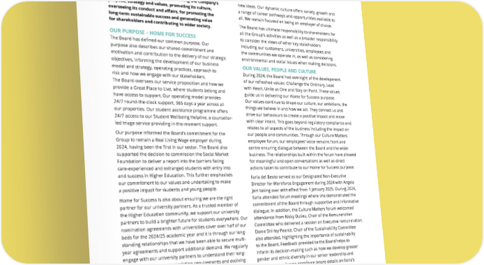THE UNITE GROUP PLC Annual Report and Accounts 2024 83 BOARD LEADERSHIP AND PURPOSE The Board is responsible for establishing the Company’s purpose, strategy and values, promoting its culture, overseeing its conduct and affairs, for promoting the long-term sustainable success and generating value for shareholders and contributing to wider society. OUR PURPOSE – HOME FOR SUCCESS The Board has defined our common purpose. Our purpose also describes our shared commitment and motivation and contribution to the delivery of our strategic objectives, informing the development of our business model and strategy, operating practices, approach to risk and how we engage with our stakeholders. The Board oversees our service proposition and how we provide a Great Place to Live, where students belong and have access to support. Our operating model provides 24/7 round-the-clock support, 365 days a year across all our properties. Our student assistance programme offers 24/7 access to our Student Wellbeing Helpline, a counsellor- led triage service providing in-the-moment support. Our purpose informed the Board’s commitment for the Group to remain a Real Living Wage employer during 2024, having been the first in our sector. The Board also supported the decision to commission the Social Market Foundation to deliver a report into the barriers facing care-experienced and estranged students with entry into and success in Higher Education. This further emphasises our commitment to our values and undertaking to make a positive impact for students and young people. Home for Success is also about ensuring we are the right partner for our university partners. As a trusted member of the Higher Education community, we support our university partners to build a brighter future for students everywhere. Our nomination agreements with universities cover over half of our beds for the 2024/25 academic year and it is through our long- standing relationships that we have been able to secure multi- year agreements and support additional demand. We regularly engage with our university partners to understand their long- term aspirations, accommodation requirements and evolving expectations around student welfare. This means our offer is built around the priorities of students and universities alike. By placing people at the heart of our business, the Board’s focus on Home for Success is also about ensuring a Great Place to Work. This means an environment where our employees can grow, develop, succeed and belong. The Board is driven by our commitment to develop diverse and inclusive teams, filled with support, positive energy and new ideas. Our dynamic culture offers variety, growth and a range of career pathways and opportunities available to all. We remain focused on being an employer of choice. The Board has ultimate responsibility to shareholders for all the Group’s activities as well as a broader responsibility to consider the views of other key stakeholders including our customers, universities, employees and the communities we operate in, as well as considering environmental and social issues when making decisions. OUR VALUES, PEOPLE AND CULTURE During 2024, the Board had oversight of the development of our refreshed values: Challenge the Ordinary, Lead with Heart, Unite as One and Stay on Point. These values guide us in delivering our Home for Success purpose. Our values continue to shape our culture, our ambitions, the things we believe in and how we act. They connect us and drive our behaviours to create a positive impact and move with clear intent. This goes beyond regulatory compliance and relates to all aspects of the business including the impact on our people and communities. Through our Culture Matters employee forum, our employees’ voice remains front and centre ensuring dialogue between the Board and the wider business. The relationships built within the forum have allowed for meaningful and open conversations as well as direct actions taken to contribute to our Home for Success purpose. Ilaria del Beato served as our Designated Non-Executive Director for Workforce Engagement during 2024 with Angela Jain taking over with effect from 1 January 2025. During 2024, Ilaria attended forum meetings where she demonstrated the commitment of the Board through supportive and informative dialogue. In addition, the Culture Matters forum welcomed attendance from Nicky Dulieu, Chair of the Remuneration Committee who delivered a session on Executive remuneration. Dame Shirley Pearce, Chair of the Sustainability Committee also attended, highlighting the importance of sustainabilty to the Board. Feedback provided to the Board helps to inform its decision-making such as how we develop greater gender and ethnic diversity in our senior leadership and create a more diverse workforce (more details on Ilaria’s role and activities during 2024 can be found on page 86). HOW THE BOARD MONITORS OUR CULTURE Our culture defines what makes Unite Students a Great Place to Work and a great company to do business with and this forms the fundamental basis for our governance. During the year, the Board received regular updates on our first culture audit. Over 100 employees from across