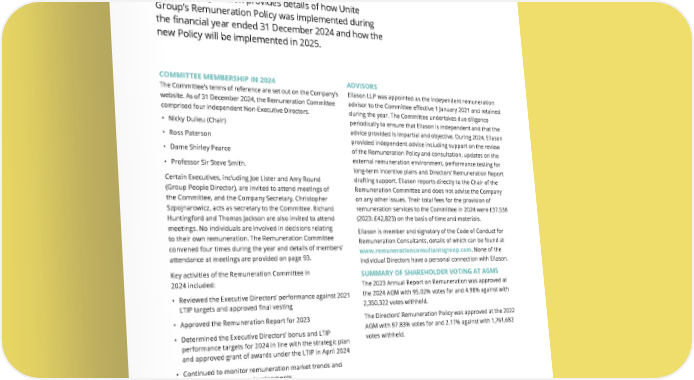 THE UNITE GROUP PLC Annual Report and Accounts 2024 127 ANNUAL REPORT ON REMUNERATION COMMITTEE MEMBERSHIP IN 2024 The Committee’s terms of reference are set out on the Company’s website. As of 31 December 2024, the Remuneration Committee comprised four independent Non-Executive Directors. • Nicky Dulieu (Chair) • Ross Paterson • Dame Shirley Pearce • Professor Sir Steve Smith. Certain Executives, including Joe Lister and Amy Round (Group People Director), are invited to attend meetings of the Committee, and the Company Secretary, Christopher Szpojnarowicz, acts as secretary to the Committee. Richard Huntingford and Thomas Jackson are also invited to attend meetings. No individuals are involved in decisions relating to their own remuneration. The Remuneration Committee convened four times during the year and details of members’ attendance at meetings are provided on page 93. Key activities of the Remuneration Committee in 2024 included: • Reviewed the Executive Directors’ performance against 2021 LTIP targets and approved final vesting • Approved the Remuneration Report for 2023 • Determined the Executive Directors’ bonus and LTIP performance targets for 2024 in line with the strategic plan and approved grant of awards under the LTIP in April 2024 • Continued to monitor remuneration market trends and corporate governance developments • Reviewed the CEO pay ratio and gender pay data and disclosures • Reviewed the Remuneration Policy and conducted shareholder consultations on the proposed changes • Considered feedback from the Culture Matters forum • Reviewed the fee payable to the Board Chair • Commenced preparation of the 2024 DRR. ADVISORS Ellason LLP was appointed as the independent remuneration advisor to the Committee effective 1 January 2021 and retained during the year. The Committee undertakes due diligence periodically to ensure that Ellason is independent and that the advice provided is impartial and objective. During 2024, Ellason provided independent advice including support on the review of the Remuneration Policy and consultation, updates on the external remuneration environment, performance testing for long-term incentive plans and Directors’ Remuneration Report drafting support. Ellason reports directly to the Chair of the Remuneration Committee and does not advise the Company on any other issues. Their total fees for the provision of remuneration services to the Committee in 2024 were £37,538 (2023: £42,823) on the basis of time and materials. Ellason is member and signatory of the Code of Conduct for Remuneration Consultants, details of which can be found at www.remunerationconsultantsgroup.com. None of the individual Directors have a personal connection with Ellason. SUMMARY OF SHAREHOLDER VOTING AT AGMS The 2023 Annual Report on Remuneration was approved at the 2024 AGM with 95.02% votes for and 4.98% against with 2,350,322 votes withheld. The Directors’ Remuneration Policy was approved at the 2022 AGM with 97.83% votes for and 2.17% against with 1,761,682 votes withheld. The following section provides details of how Unite Group’s Remuneration Policy was implemented during the financial year ended 31 December 2024 and how the new Policy will be implemented in 2025.