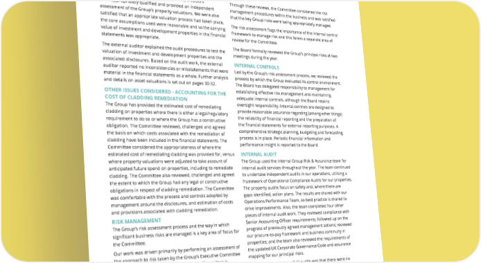 THE UNITE GROUP PLC Annual Report and Accounts 2024 104 The Committee was satisfied that the Group’s valuers were appropriately qualified and provided an independent assessment of the Group’s property valuations. We were also satisfied that an appropriate valuation process had taken place, the core assumptions used were reasonable and so the carrying value of investment and development properties in the financial statements was appropriate. The external auditor explained the audit procedures to test the valuation of investment and development properties and the associated disclosures. Based on the audit work, the external auditor reported no inconsistencies or misstatements that were material in the financial statements as a whole. Further analysis and details on asset valuations is set out on pages 30-32. OTHER ISSUES CONSIDERED - ACCOUNTING FOR THE COST OF CLADDING REMEDIATION The Group has provided the estimated cost of remediating cladding on properties where there is either a legal/regulatory requirement to do so or where the Group has a constructive obligation. The Committee reviewed, challenged and agreed the basis on which costs associated with the remediation of cladding have been included in the financial statements. The Committee considered the appropriateness of where the estimated cost of remediating cladding was provided for, versus where property valuations were adjusted to take account of anticipated future spend on properties, including to remediate cladding. The Committee also reviewed, challenged and agreed the extent to which the Group had any legal or constructive obligations in respect of cladding remediation. The Committee was comfortable with the process and controls adopted by management around the disclosures, and estimation of costs and provisions associated with cladding remediation. RISK MANAGEMENT The Group’s risk assessment process and the way in which significant business risks are managed is a key area of focus for the Committee. Our work was driven primarily by performing an assessment of the approach to risk taken by the Group’s Executive Committee and senior leadership team. The Executive Committee is responsible for the delivery of the Group’s risk management framework. The Executive Committee and senior leadership team set the objectives for the Group and then assess what risks could prevent the Group from meeting these objectives. This assessment resulted in a number of principal and emerging risks being brought to the Board for a detailed assessment. The Committee considered and approved both the Group’s Risk Management Framework and the Group’s assessment of its principal risks and uncertainties, as set out on pages 52-71. Through these reviews, the Committee considered the risk management procedures within the business and was satisfied that the key Group risks were being appropriately managed. The risk assessment flags the importance of the internal control framework to manage risk and this forms a separate area of review for the Committee. The Board formally reviewed the Group’s principal risks at two meetings during the year. INTERNAL CONTROLS Led by the Group’s risk assessment process, we reviewed the process by which the Group evaluated its control environment. The Board has delegated responsibility to management for establishing effective risk management and maintaining adequate internal controls, although the Board retains oversight responsibility. Internal controls are designed to provide reasonable assurance regarding (among other things) the reliability of financial reporting and the preparation of the financial statements for external reporting purposes. A comprehensive strategic planning, budgeting and forecasting process is in place. Periodic financial information and performance insight is reported to the Board. INTERNAL AUDIT The Group used the internal Group Risk & Assurance team for internal audit services throughout the year. The team continued to undertake independent audits in our operations, utilising a framework of Operational Compliance Audits for our properties. The property audits focus on safety and, where there are gaps identified, action plans. The results are shared with our Operations Performance Team, so best practice is shared to drive improvements. Also, the team completed four other pieces of internal audit work. They reviewed compliance with Senior Accounting Officer requirements; followed up on the progress of previously agreed management actions; reviewed our procure-to-pay framework and business continuity in properties; and the team also reviewed the requirements of the updated UK Corporate Governance Code and assurance mapping for our principal risks. Overall, the conclusion of all audits was that there were no significant issues and controls were well designed, but we noted there were some areas of improvement to be made to maximise controls and operational efficiency, which management is in the process of implementing. EXTERNAL AUDIT The effectiveness of the external audit process is facilitated by appropriate audit risk identification at the start of the audit cycle which we receive from Deloitte in a detailed audit plan, identifying its assessment of these key risks. AUDIT & RISK COMMITTEE continued GOVERNANCE