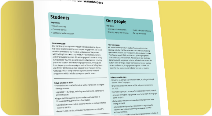 THE UNITE GROUP PLC Annual Report and Accounts 2024 11 How we engage Our frontline property teams engage with students on a day-to- day basis, supplemented by peer-to-peer engagement and social activities provided by our resident ambassadors. We partner with Endsleigh Insurance to provide 24/7 access to counsellors and other support services. We also engage with students using our upgraded MyUnite app and social media channels, including pre-arrival support and networking opportunities. Throughout their stay we promote campaigns, such as Personal Safety Week and Winter Wellbeing, and we signpost to our Support for You web page. This is complemented by our customer research programme which includes surveys on specific issues. Value created in 2024 • Provided access to a 24/7 student wellbeing helpline and digital therapy services. • Upgraded 11 buildings, including new bedrooms, kitchens and amenity spaces. • Supported the award of accommodation scholarships to 95 students through the Unite Foundation. • Launched our new student app and website to further enhance customer service. • Research with the Social Market Foundation on care leavers. Priorities for 2025 Upgrades to bedrooms, kitchens and amenity spaces in our new developments and refurbishment projects. Improved capture of additional needs prior to arrival to respond to the differing needs of under-represented students, and those with additional challenges relating to the transition into student accommodation. Investment in our technology platform to deliver an improved end-to-end experience for students from booking, through their time with us and ultimately when they leave. Students Key issues • Value-for-money • Customer service • Safety and welfare support How we engage We hosted quarterly Culture Matters forums and Unite Live sessions with the Chief Executive and Executive team, fostering open communication and transparency. We conducted the Have Your Say survey with 84% participation, gathering insights to drive continuous improvement. We co-created new values and behaviours with our people, to better reflect who we are and the culture we’re striving to create. We hosted our senior leaders at two conferences, bringing them together to share our vision for the business and to better connect as leaders. Value created in 2024 • Delivered an average pay increase of 8.8%, including a 10% uplift for over 70% of employees. • Employee attrition decreased to 25%, a 4-point improvement on 2023. • Launched My Impact, a new performance enablement framework. • Achieved our highest engagement score in two years of 74, up by 4 points on 2023. • Delivered our first-ever culture audit, identifying areas to keep, change, and add. • Advanced diversity, equity, and inclusion through impactful networks and policies supporting menopause, disability and neurodiversity. • The Academy provided tailored learning experiences, including an 18-month programme for general managers. Priorities for 2025 We will launch an integrated online platform to support performance, learning, and goal setting through My Impact. We will roll out refreshed values and behaviours across the business. Our people Key issues • Learning and development • Diversity, equity and inclusion • Health, safety and wellbeing • Fair pay and reward Creating value for our stakeholders