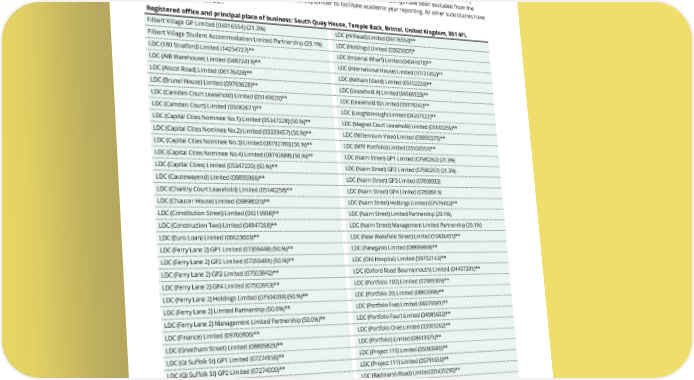 THE UNITE GROUP PLC Annual Report and Accounts 2024 208 FINANCIAL STATEMENTS Section 9: Company subsidiaries and joint ventures In accordance with Section 409 of the Companies Act 2006, a full list of subsidiaries and equity accounted investments as at 31 December 2024 is disclosed below. Unless otherwise stated, the Group’s ownership interest represents 100% of the ordinary shares, units or partnership capital held indirectly by Unite Group PLC. No subsidiary undertakings have been excluded from the consolidation. The Unite Foundation has a year-end of 30 September to facilitate academic year reporting. All other subsidiaries have a year-end of 31 December. Registered office and principal place of business: South Quay House, Temple Back, Bristol, United Kingdom, BS1 6FL Filbert Village GP Limited (06016554) (21.3%) LDC (Hillhead) Limited (06176554)** Filbert Village Student Accommodation Limited Partnership (29.1%) LDC (Holdings) Limited (02625007)* LDC (180 Stratford) Limited (14254727)** LDC (Imperial Wharf) Limited (04541678)** LDC (AIB Warehouse) Limited (04872419)** LDC (International House) Limited (10131352)** LDC (Alscot Road) Limited (06176428)** LDC (Kelham Island) Limited (05152229)** LDC (Brunel House) Limited (09760628)** LDC (Leasehold A) Limited (04066933)** LDC (Camden Court Leasehold) Limited (05140620)** LDC (Leasehold B) Limited (05978242)** LDC (Camden Court) Limited (05082671)** LDC (Loughborough) Limited (04207522)** LDC (Capital Cities Nominee No.1) Limited (05347228) (50.%)** LDC (Magnet Court Leasehold) Limited (05140255)** LDC (Capital Cities Nominee No.2) Limited (05359457) (50.%)** LDC (Millennium View) Limited (09890375)** LDC (Capital Cities Nominee No.3) Limited (08792780) (50.%)** LDC (MTF Portfolio) Limited (05530557)** LDC (Capital Cities Nominee No.4) Limited (08792688) (50.%)** LDC (Nairn Street) GP1 Limited (07580262) (21.3%) LDC (Capital Cities) Limited (05347220) (50.%)** LDC (Nairn Street) GP2 Limited (07580257) (21.3%) LDC (Causewayend) Limited (08895966)** LDC (Nairn Street) GP3 Limited (07808933) LDC (Chantry Court Leasehold) Limited (05140258)** LDC (Nairn Street) GP4 Limited (07808919) LDC (Chaucer House) Limited (09898020)** LDC (Nairn Street) Holdings Limited (07579402)** LDC (Constitution Street) Limited (09210998)** LDC (Nairn Street) Limited Partnership (29.1%) LDC (Construction Two) Limited (04847268)** LDC (Nairn Street) Management Limited Partnership (29.1%) LDC (Euro Loan) Limited (06623603)** LDC (New Wakefield Street) Limited (10436455)** LDC (Ferry Lane 2) GP1 Limited (07359448) (50.%)** LDC (Newgate) Limited (08895869)** LDC (Ferry Lane 2) GP2 Limited (07359481) (50.%)** LDC (Old Hospital) Limited (09702143)** LDC (Ferry Lane 2) GP3 Limited (07503842)** LDC (Oxford Road Bournemouth) Limited (04407309)** LDC (Ferry Lane 2) GP4 Limited (07503913)** LDC (Portfolio 100) Limited (07989369)** LDC (Ferry Lane 2) Holdings Limited (07504099) (50.%)** LDC (Portfolio 20) Limited (08803996)** LDC (Ferry Lane 2) Limited Partnership (50.0%)** LDC (Portfolio Five) Limited (06079581)** LDC (Ferry Lane 2) Management Limited Partnership (50.0%)** LDC (Portfolio Four) Limited (04985603)** LDC (Finance) Limited (09760806)** LDC (Portfolio One) Limited (03005262)** LDC (Greetham Street) Limited (08895825)** LDC (Portfolio) Limited (08419375)** LDC (Gt Suffolk St) GP1 Limited (07274156)** LDC (Project 110) Limited (05083580)** LDC (Gt Suffolk St) GP2 Limited (07274000)** LDC (Project 111) Limited (05791650)** LDC (Gt Suffolk St) Holdings Limited (07353946)** LDC (Radmarsh Road) Limited (05435290)** LDC (Gt Suffolk St) Limited Partnership** LDC (Skelhorne) Limited (09898132)** LDC (Gt Suffolk St) Management GP1 Limited (07354719)** LDC (Smithfield) Limited (03373096)** LDC (Gt Suffolk St) Management GP2 Limited (07354728)** LDC (St Leonards) Limited (08895830)** LDC (Gt Suffolk St) Management Limited Partnership** LDC (St Pancras Way) GP1 Limited (07359501)** LDC (Hampton Street) Limited (06415998)** LDC (St Pancras Way) GP2 Limited (07359428)** * Held directly by the Company. ** Company is exempt from the requirements of the Companies Act relating to the audit of individual financial statements by virtue of s477 or s379A for the financial year ended 31 December 2024. NOTES TO THE FINANCIAL STATEMENTS continued