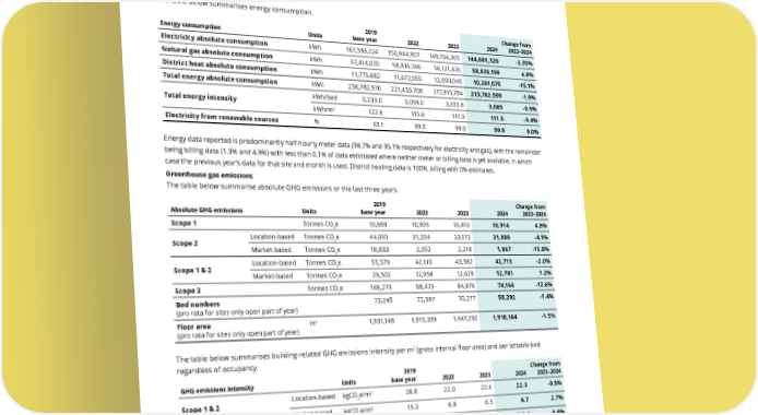 THE UNITE GROUP PLC Annual Report and Accounts 2024 48 STRATEGIC REPORT PERFORMANCE REVIEW Sustainability continued Energy consumption The table below summarises energy consumption. Energy consumption Units 2019 base year 2022 2023 2024 Change from 2023–2024 Electricity absolute consumption kWh 167,593,224 150,944,907 149,704,305 144,685,326 -3.35% Natural gas absolute consumption kWh 57,414,070 58,816,746 56,121,430 58,836,198 4.8% District heat absolute consumption kWh 11,775,682 11,672,055 12,090,049 10,261,075 -15.1% Total energy absolute consumption kWh 236,782,976 221,433,708 217,915,784 213,782,599 -1.9% Total energy intensity kWh/bed 3,233.0 3,059.0 3,100.8 3,085 -0.5% kWh/m2 122.6 115.6 111.9 111.5 -0.4% Electricity from renewable sources % 61.1 99.9 99.9 99.9 0.0% Energy data reported is predominantly half-hourly meter data (98.7% and 95.1% respectively for electricity and gas), with the remainder being billing data (1.3% and 4.9%) with less than 0.1% of data estimated where neither meter or billing data is yet available, in which case the previous year’s data for that site and month is used. District heating data is 100%, billing with 0% estimates. Greenhouse gas emissions The table below summarise absolute GHG emissions or the last three years. Absolute GHG emissions Units 2019 base year 2022 2023 2024 Change from 2023–2024 Scope 1 Tonnes CO2e 10,669 10,905 10,410 10,914 4.8% Scope 2 Location-based Tonnes CO2e 44,910 31,204 33,172 31,800 -4.1% Market-based Tonnes CO2e 18,833 2,052 2,218 1,867 -15.8% Scope 1 & 2 Location-based Tonnes CO2e 55,579 42,110 43,582 42,715 -2.0% Market-based Tonnes CO2e 29,502 12,958 12,628 12,781 1.2% Scope 3 Tonnes CO2e 148,279 98,475 84,876 74,166 -12.6% Bed numbers (pro rata for sites only open part of year) 73,240 72,387 70,277 69,292 -1.4% Floor area (pro rata for sites only open part of year) m2 1,931,148 1,915,339 1,947,292 1,918,164 -1.5% The table below summarises building-related GHG emissions intensity per m2 (gross internal floor area) and per lettable-bed regardless of occupancy. GHG emissions intensity Units 2019 base year 2022 2023 2024 Change from 2023–2024 Scope 1 & 2 by floor area Location-based kgCO2e/m2 28.8 22.0 22.4 22.3 -0.5% Market-based kgCO2e/m2 15.3 6.8 6.5 6.7 2.7% Scope 1 & 2 by bed numbers Location-based kgCO2e/bed 758.9 581.7 620.1 616.4 -0.6% Market-based kgCO2e/bed 402.8 179.0 179.7 184.4 2.6%