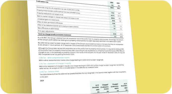 THE UNITE GROUP PLC Annual Report and Accounts 2024 170 FINANCIAL STATEMENTS 2.5a) Tax - income statement continued In the income statement, a tax charge of £2.2 million arises on a profit before tax of £444.0 million. The taxation charge that would arise at the standard rate of UK corporation tax is reconciled to the actual tax charge as follows: 2024 2023 £m £m Profit before tax 444.0 102.5 Income tax using the UK corporation tax rate of 25% (2023: 23.5%) 111.0 24.1 Property rental business profits exempt from tax in the REIT Group (42.7) (45.7) Property revaluations not subject to tax (66.6) 16.2 Mark to market changes in interest rate swaps not subject to tax (0.4) 3.0 Unrealised gains on investments (0.4) - Effect of other permanent differences 1.4 1.3 Effect of tax deduction transferred to equity on share schemes 0.1 0.2 Rate difference on deferred tax - - Prior years adjustments (0.2) (0.2) Total tax charge/(credit) in income statement 2.2 (1.1) As a UK REIT, the Group is exempt from UK corporation tax on the profits from its property rental business. Accordingly, the element of the Group’s profit before tax relating to its property rental business has been separately identified in the reconciliation above. No deferred tax asset has been recognised in respect of the Group’s accumulated tax losses on the basis that they are not expected to be utilised in future periods. At 31 December 2024, these losses totalled £15.3 million (2023: £15.3 million). Although the Group does not pay UK corporation tax on the profits from its property rental business, it is required to distribute 90% of the profits from its property rental business after accounting for tax adjustments as a Property Income Distribution (PID). PIDs are charged to tax in the same way as property income in the hands of the recipient. For the year ended 31 December 2024, the required PID is expected to be fully paid by the end of 2025. 2.5b) Tax – other comprehensive income Within other comprehensive income a tax charge totalling £nil (2023: £nil) has been recognised. 2.5c) Tax – statement of changes in equity Within the statement of changes in equity a tax charge totalling £nil (2023: £0.2 million charge) has been recognised representing deferred tax. An analysis of this is included below in the deferred tax movement table. 2.5d) Tax – balance sheet The table below outlines the deferred tax (assets)/liabilities that are recognised in the balance sheet, together with their movements in the year: 2024 Charged/ Charged/ At 31 (Credited) in (Credited) in At 31 December 2023 income equity December 2024 £m £m £m £m Investments 0.4 (0.4) - - Property, plant and machinery (4.9) (2.3) - (7.2) Share schemes (1.1) - 0.1 (1.0) Tax value of carried forward losses recognised - 0.1 (0.1) - Net tax liabilities/(assets) (5.6) (2.6)* - (8.2) * The £2.6m credit above includes tax movements totalling £2.3m in respect of Property, plant and machinery and Losses which are included in EPRA, which is why they are not included in the IFRS reconciliation in note 2.2b). NOTES TO THE FINANCIAL STATEMENTS continued