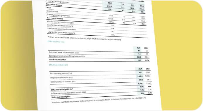 THE UNITE GROUP PLC Annual Report and Accounts 2024 205 EPRA like-for-like rental income (calculated based on total portfolio value of £9.1 billion) Like-for-like properties Development property Other Properties* Total EPRA Earnings 2024 Rental income 345.7 6.8 45.5 398.0 Property operating expenses (106.4) (2.1) (13.4) (121.9) Net rental income 239.3 4.7 32.1 276.1 2023 Rental income 321.5 2.0 46.0 369.5 Property operating expenses (100.0) (0.4) (12.6) (113.0) Net rental income 221.5 1.6 33.4 256.5 Like-for-like net rental income £m 18.0 Like-for-like net rental income % 8.0% Like-for-like gross rental income £m 24.2 Like-for-like gross rental income % 7.5% * Other properties include acquisitions, disposals, major refurbishments and changes in ownership. EPRA vacancy rate 2024 2023 £m £m Estimated rental value of vacant space 6.5 0.9 Estimated rental value of the whole portfolio 320.3 283.9 EPRA vacancy rate 2.0% 0.3% EPRA net initial yield 2024 2023 Net operating income (£m) 305.5 278.3 Property market value (£m) 5,948.2 5,510.4 Notional acquisition costs (£m) 392.2 288.6 6,340.3 5,799.0 EPRA net initial yield (%)* 4.8% 4.8% Difference in projected versus historical GOI 0.3% 0.2% Unite net initial yield 5.1% 5.0% * No lease incentives are provided by the Group and accordingly the Topped Up Net Initial Yield measure is also 4.8% (2023: 4.8%).