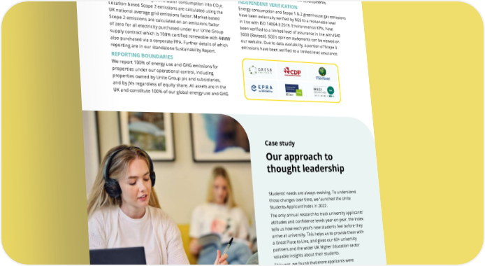 CALCULATION METHODOLOGY GHG emissions are calculated in accordance with the UK Government’s Environmental Reporting Guidelines: including streamlined energy and carbon reporting March 2019 and the GHG Protocol’s A Corporate Accounting and Reporting Standard including recent updates on Scope 2 reporting. The UK Government emission conversion factors for greenhouse gas company reporting (2024 data set) have been used to convert data from sources including utilities meters, business travel mileage, and water consumption into CO2e. Location-based Scope 2 emissions are calculated using the UK national average grid emissions factor. Market-based Scope 2 emissions are calculated on an emissions factor of zero for all electricity purchased under our Unite Group supply contract which is 100% certified renewable with 44MW also purchased via a corporate PPA. Further details of which reporting are in our standalone Sustainability Report. REPORTING BOUNDARIES We report 100% of energy use and GHG emissions for properties under our operational control, including properties owned by Unite Group plc and subsidiaries, and by JVs regardless of equity share. All assets are in the UK and constitute 100% of our global energy use and GHG emissions. Data has not been normalised or adjusted for any factors such as occupancy or weather. Student residents pay a single all-inclusive bill, and are not charged for any energy, heat or hot water they consume; hence all energy used in our buildings contributes directly towards Scope 1 & 2 GHG emissions, rather than falling into Scope 3 emissions. Consequently, our most significant source of Scope 3 emissions is embodied carbon in new developments. INDEPENDENT VERIFICATION Energy consumption and Scope 1 & 2 greenhouse gas emissions have been externally verified by SGS to a reasonable level in line with ISO 14064-3:2019. Environmental KPIs, have been verified to a limited level of assurance in line with ISAE 3000 (Revised). SGS’s opinion statements can be viewed on our website. Due to data availability, a portion of Scope 3 emissions have been verified to a limited level assurance. THE UNITE GROUP PLC Annual Report and Accounts 2024 51 Case study Our approach to thought leadership Students’ needs are always evolving. To understand those changes over time, we launched the Unite Students Applicant Index in 2022. The only annual research to track university applicants’ attitudes and confidence levels year-on-year, the Index tells us how each year’s new students feel before they arrive at university. This helps us to provide them with a Great Place to Live, and gives our 60+ university partners and the wider UK Higher Education sector valuable insights about their students. This year, we found that more applicants were motivated by moving away from home than five years ago, as well as major differences in confidence between socioeconomic groups. In December, we partnered with the Unite Foundation to commission a report from the Social Market Foundation. Care and Learning in Higher Education looked at the barriers estranged and care-experienced young people face in going to university, and how they can be supported.