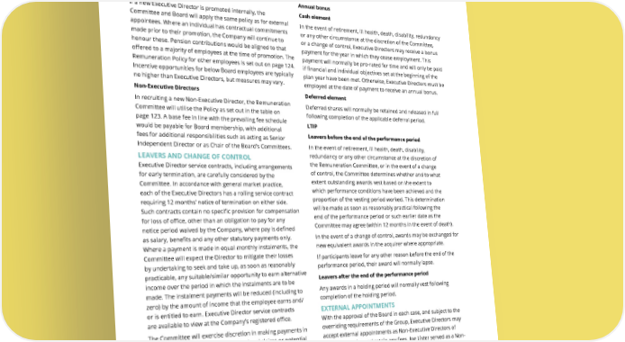 THE UNITE GROUP PLC Annual Report and Accounts 2024 126 Internal promotion to the Board If a new Executive Director is promoted internally, the Committee and Board will apply the same policy as for external appointees. Where an individual has contractual commitments made prior to their promotion, the Company will continue to honour these. Pension contributions would be aligned to that offered to a majority of employees at the time of promotion. The Remuneration Policy for other employees is set out on page 124. Incentive opportunities for below Board employees are typically no higher than Executive Directors, but measures may vary. Non-Executive Directors In recruiting a new Non-Executive Director, the Remuneration Committee will utilise the Policy as set out in the table on page 123. A base fee in line with the prevailing fee schedule would be payable for Board membership, with additional fees for additional responsibilities such as acting as Senior Independent Director or as Chair of the Board’s Committees. LEAVERS AND CHANGE OF CONTROL Executive Director service contracts, including arrangements for early termination, are carefully considered by the Committee. In accordance with general market practice, each of the Executive Directors has a rolling service contract requiring 12 months’ notice of termination on either side. Such contracts contain no specific provision for compensation for loss of office, other than an obligation to pay for any notice period waived by the Company, where pay is defined as salary, benefits and any other statutory payments only. Where a payment is made in equal monthly instalments, the Committee will expect the Director to mitigate their losses by undertaking to seek and take up, as soon as reasonably practicable, any suitable/similar opportunity to earn alternative income over the period in which the instalments are to be made. The instalment payments will be reduced (including to zero) by the amount of income that the employee earns and/ or is entitled to earn. Executive Director service contracts are available to view at the Company’s registered office. The Committee will exercise discretion in making payments in the context of outplacement, settling legal claims or potential legal claims by a departing Executive Director, including any other amounts reasonably due to the Executive Director, for example legal fees relating to a settlement agreement. When considering exit payments, the Committee reviews all potential incentive outcomes to ensure they are fair to both shareholders and participants. The sections below summarise how the awards under the annual bonus and LTIP are typically treated in specific circumstances, with the final treatment remaining subject to the Committee’s discretion. Annual bonus Cash element In the event of retirement, ill health, death, disability, redundancy or any other circumstance at the discretion of the Committee, or a change of control, Executive Directors may receive a bonus payment for the year in which they cease employment. This payment will normally be pro-rated for time and will only be paid if financial and individual objectives set at the beginning of the plan year have been met. Otherwise, Executive Directors must be employed at the date of payment to receive an annual bonus. Deferred element Deferred shares will normally be retained and released in full following completion of the applicable deferral period. LTIP Leavers before the end of the performance period In the event of retirement, ill health, death, disability, redundancy or any other circumstance at the discretion of the Remuneration Committee, or in the event of a change of control, the Committee determines whether and to what extent outstanding awards vest based on the extent to which performance conditions have been achieved and the proportion of the vesting period worked. This determination will be made as soon as reasonably practical following the end of the performance period or such earlier date as the Committee may agree (within 12 months in the event of death). In the event of a change of control, awards may be exchanged for new equivalent awards in the acquirer where appropriate. If participants leave for any other reason before the end of the performance period, their award will normally lapse. Leavers after the end of the performance period Any awards in a holding period will normally vest following completion of the holding period. EXTERNAL APPOINTMENTS With the approval of the Board in each case, and subject to the overriding requirements of the Group, Executive Directors may accept external appointments as Non-Executive Directors of other companies and retain any fees. Joe Lister served as a Non- Executive Director on the Board of Helical Plc until 17 July 2024, and received a fee of c.£35k in respect of his service for 2024. Mike Burt does not currently hold any external appointments. DIRECTORS’ REMUNERATION POLICY continued GOVERNANCE