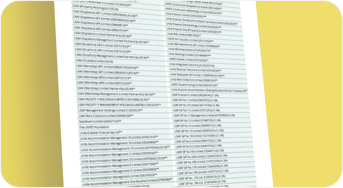 THE UNITE GROUP PLC Annual Report and Accounts 2024 210 FINANCIAL STATEMENTS Registered office and principal place of business: South Quay House, Temple Back, Bristol, United Kingdom, BS1 6FL LSAV (No.1) GP3 Limited (13184662)** UNITE Capital Cities Two GP3 Limited (16148993)** LSAV (No.1) LP (50.%)** Unite Capital Cities Two Limited Partnership (50.%) LSAV (No.1) Management LP (50.%)** UNITE Construction (Angel Lane) Limited (08792704)** LSAV (No.1) Nominee 1 Limited (13184589) (50.%)** UNITE Construction (Stapleton) Limited (09023406)** LSAV (No.1) Nominee 3 Limited (13184656)** UNITE Construction (Wembley) Limited (09023474)** LSAV (Property Holdings) LP (50.%) Unite Finance Limited (04353305)*/** LSAV (Stapleton) GP1 Limited (08593695) (50.%)** Unite Finance One (Accommodation Services) Limited (04332937)** LSAV (Stapleton) GP2 Limited (08593699) (50.%)** Unite Finance One (Holdings) Limited (04316207)** LSAV (Stapleton) GP3 Limited (08646819)** Unite Finance One (Property) Limited (04303331)** LSAV (Stapleton) GP4 Limited (08647019)** Unite FM Limited (06807562)** LSAV (Stapleton) Limited Partnership (50.%)** UNITE For Success Limited (05157263)** LSAV (Stapleton) Management Limited Partnership (50.%)** Unite HEI Investments GP Limited (15584836)** LSAV (Stratford) GP3 Limited (08751654)** Unite HEI Investments LP (LP023677)** LSAV (Stratford) GP4 Limited (08751629)** Unite Holdings Limited (03148468)*/** LSAV (Stratford) Management Limited Partnership (50.%)** UNITE Homes Limited (05140262)** LSAV (Trustee) Limited (50.%) Unite Integrated Solutions plc (02402714) LSAV (Wembley) GP1 Limited (08635735) (50.%)** Unite Modular Solutions Limited (05140259)** LSAV (Wembley) GP2 Limited (08636051) (50.%)** Unite Newcastle GP Limited (15588783) (51.0%)** LSAV (Wembley) GP3 Limited (08725127)** Unite Rent Collection Limited (05982935)** LSAV (Wembley) GP4 Limited (08725235)** UNITE Student Living Limited (06204135)** LSAV (Wembley) Limited Partnership (50.%)** Unite Students Accommodation (Beijing) Business Service Company Ltd** LSAV (Wembley) Management Limited Partnership (50.%)** USAF Finance II Limited (08526474) (21.3%) LSAV FACILITY 1 HOLDINGS LIMITED (13913388) (50.%)** USAF GP No 1 Limited (05897875) (21.3%) LSAV FACILITY 1 MANAGEMENT HOLDINGS LIMITED (13913371)** USAF GP No 10 Limited (06714734) (21.3%) LSAV Management Holdings Limited (13305327)** USAF GP No 11 Limited (07075210) (21.3%) LSAV Rent Collection Limited (08496230)** USAF GP No 11 Management Limited (07351883) (21.3%) Stardesert Limited (04437102)** USAF GP No 12 Limited (07368735) (21.3%) The UNITE Foundation USAF GP No 14 Limited (09089977) (21.3%) Unite (Capital Cities) Jersey Ltd** USAF GP No 15 Limited (09585201) (21.3%) Unite Accommodation Management 16 Limited (07061314)** USAF GP No 18 Limited (10219336) (21.3%) Unite Accommodation Management 18 Limited (08328484)** USAF GP No 6 Limited (05897755) (21.3%) Unite Accommodation Management 19 Limited (08790504) (50.%)** USAF GP No 8 Limited (06381914) (21.3%) Unite Accommodation Management 2 Limited (05193166)** USAF GP No.15A Limited (12644211) (21.3%) Unite Accommodation Management 20 Limited (08790642) (50.%)** USAF GP No.16A Limited (12644210) (21.3%) Unite Accommodation Management 6 Limited (05077346)** USAF GP No.16B Limited (14707370) (21.3%) Unite Accommodation Management 9 Limited (06190863)** USAF GP No.17A Limited (12644208) (21.3%) Unite Accommodation Management Limited (06190905)** USAF GP No.17B Limited (14707101) (21.3%) Unite Accommodation Management One Hundred Limited (07989080)** USAF GP No. 17C Ltd (15455410) (21.3%) Unite Capital Cities 3 GP1 Limited (13913884) (50.%) USAF GP No. 18A Ltd (15455404) (21.3%) UNITE CAPITAL CITIES 3 LIMITED PARTNERSHIP (50.%)** USAF GP No.19 Limited (14707096) (21.3%) Unite Capital Cities 3 Management Limited (13913891) (50.%)** USAF Holdings K Limited (14700139) (21.3%) Unite Capital Cities 3 Nominee 1 Limited (13913890) (50.%)** USAF Holdings B Limited (06324325) (21.3%) UNITE Capital Cities Holdings Limited (08801242) (50.%)** USAF Holdings C Limited (06381882) (21.3%) Unite Capital Cities Limited Partnership (50.%)** USAF Holdings H Limited (09089805) (21.3%) * Held directly by the Company. ** Company is exempt from the requirements of the Companies Act relating to the audit of individual financial statements by virtue of s477 or s379A for the financial year ended 31 December 2024. NOTES TO THE FINANCIAL STATEMENTS continued
