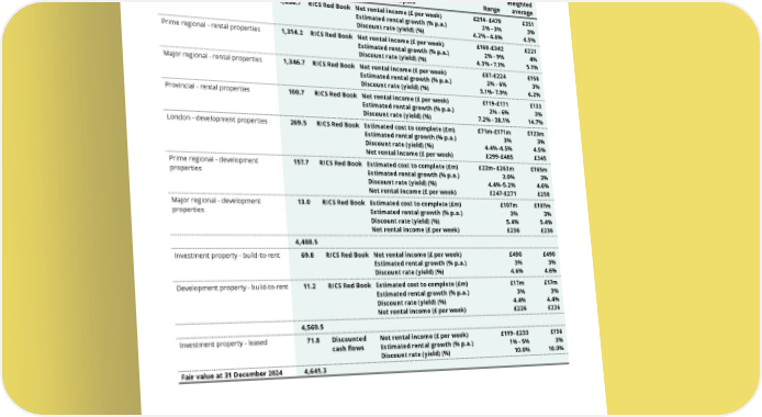 THE UNITE GROUP PLC Annual Report and Accounts 2024 176 FINANCIAL STATEMENTS Quantitative information about fair value measurements using unobservable inputs (Level 3) 2024 Fair value £m Valuation technique Unobservable inputs Range Weighted average London - rental properties 1,286.7 RICS Red Book Net rental income (£ per week) Estimated rental growth (% p.a.) Discount rate (yield) (%) £214- £479 2% - 3% 4.2% - 4.8% £351 3% 4.5% Prime regional - rental properties 1,314.2 RICS Red Book Net rental income (£ per week) Estimated rental growth (% p.a.) Discount rate (yield) (%) £160-£342 2% - 9% 4.3% - 7.1% £221 4% 5.1% Major regional - rental properties 1,346.7 RICS Red Book Net rental income (£ per week) Estimated rental growth (% p.a.) Discount rate (yield) (%) £87-£224 2% - 6% 5.1%- 7.9% £158 3% 6.2% Provincial - rental properties 100.7 RICS Red Book Net rental income (£ per week) Estimated rental growth (% p.a.) Discount rate (yield) (%) £119-£171 2% - 6% 7.2% - 38.1% £133 3% 14.7% London - development properties 269.5 RICS Red Book Estimated cost to complete (£m) Estimated rental growth (% p.a.) Discount rate (yield) (%) Net rental income (£ per week) £71m-£171m 3% 4.4%-4.5% £299-£485 £123m 3% 4.5% £345 Prime regional - development properties 157.7 RICS Red Book Estimated cost to complete (£m) Estimated rental growth (% p.a.) Discount rate (yield) (%) Net rental income (£ per week) £22m- £263m 3.0% 4.4%-5.2% £247-£271 £165m 3% 4.6% £258 Major regional - development properties 13.0 RICS Red Book Estimated cost to complete (£m) Estimated rental growth (% p.a.) Discount rate (yield) (%) Net rental income (£ per week) £107m 3% 5.4% £236 £107m 3% 5.4% £236 4,488.5 Investment property - build-to-rent 69.8 RICS Red Book Net rental income (£ per week) Estimated rental growth (% p.a.) Discount rate (yield) (%) £490 3% 4.6% £490 3% 4.6% Development property - build-to-rent 11.2 RICS Red Book Estimated cost to complete (£m) Estimated rental growth (% p.a.) Discount rate (yield) (%) Net rental income (£ per week) £17m 3% 4.4% £226 £17m 3% 4.4% £226 4,569.5 Investment property - leased 71.8 Discounted cash flows Net rental income (£ per week) Estimated rental growth (% p.a.) Discount rate (yield) (%) £119- £233 1% - 5% 10.0% £156 3% 10.0% Fair value at 31 December 2024 4,641.3 NOTES TO THE FINANCIAL STATEMENTS continued
