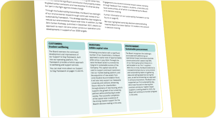 THE UNITE GROUP PLC Annual Report and Accounts 2024 92 CUSTOMERS: Student wellbeing INVESTORS: £450m capital raise ENVIRONMENT: Sustainable procurement The Board oversees the continued development and improvement of our Support to Stay framework, built into our operating platform. This framework provides a holistic approach to wellbeing and support services. You can read more about our Support to Stay framework on pages 12 and 45. Following consultation with a significant number of our shareholders, the Board approved a capital raise of approximately £450 million in July 2024. Through the raise the Board acted to promote the long-term sustainable success of the Company. This capital raise will be used to support continued investment into our market-leading platform, and the acquisition of new assets from Unite Student Accommodation Fund. It will also help support our Newcastle University joint venture, enhancing future returns for shareholders through delivery of new housing, which supports the growth of our university partners while contributing to wider society. The successful completion of the capital raise is evidence of the strong investor support for the Board’s decision-making in this area. The Board recognises the challenges associated with addressing our operational Scope 3 emissions (outside construction) and is aware that 99% of our third-party carbon footprint is attributable to our Tier 1 suppliers. With this in mind, the Board endorsed a renewed emphasis by our procurement and sustainability teams on gathering data and setting baselines during the year, as well as enhancing our approach to ethical procurement. The Board also supported our first sustainability day, which was focused on sharing best practices among our highest impact suppliers. Looking ahead to 2025, the Board will continue to monitor progress in this area. proactively manage environmental, social and governance risks. We understand the significant contribution that property makes to global carbon emissions and how essential it is that we play our part in the fight against climate change. Through the Sustainability Committee, the Board has oversight of our environmental impact through continued review of our sustainability framework. This strategy specifies clear targets to reduce our environmental impact over time. In addition, our Net Zero Carbon Pathway, published in December 2021, details our approach to reach net zero carbon across our operations and developments in support of our 2030 targets. Engagement around environmental impact comes indirectly through feedback from investors, students, universities and local communities, all of which is considered by the Board in its decision-making. Further information on our sustainability framework can be found on page 43. We have highlighted some key decisions demonstrating how the Board has taken Section 172 matters into account in decision-making: OUR SECTION 172 STATEMENT continued GOVERNANCE