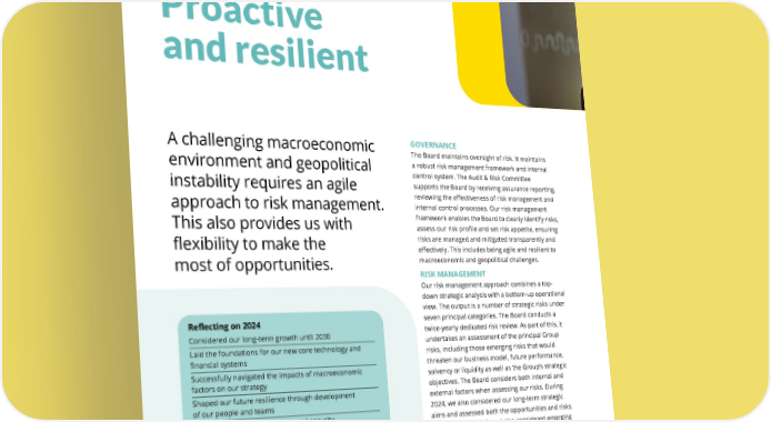 THE UNITE GROUP PLC Annual Report and Accounts 2024 52 RISK MANAGEMENT Proactive and resilient GOVERNANCE The Board maintains oversight of risk. It maintains a robust risk management framework and internal control system. The Audit & Risk Committee supports the Board by receiving assurance reporting, reviewing the effectiveness of risk management and internal control processes. Our risk management framework enables the Board to clearly identify risks, assess our risk profile and set risk appetite, ensuring risks are managed and mitigated transparently and effectively. This includes being agile and resilient to macroeconomic and geopolitical challenges. RISK MANAGEMENT Our risk management approach combines a top- down strategic analysis with a bottom-up operational view. The output is a number of strategic risks under seven principal categories. The Board conducts a twice-yearly dedicated risk review. As part of this, it undertakes an assessment of the principal Group risks, including those emerging risks that would threaten our business model, future performance, solvency or liquidity as well as the Group’s strategic objectives. The Board considers both internal and external factors when assessing our risks. During 2024, we also considered our long-term strategic aims and assessed both the opportunities and risks. Alongside this, the Board also considered emerging risks and their potential impact upon the business. A challenging macroeconomic environment and geopolitical instability requires an agile approach to risk management. This also provides us with flexibility to make the most of opportunities. STRATEGIC REPORT Reflecting on 2024 Considered our long-term growth until 2030 Laid the foundations for our new core technology and financial systems Successfully navigated the impacts of macroeconomic factors on our strategy Shaped our future resilience through development of our people and teams Enhanced our IT infrastructure and security Our priorities for 2025 Increase efficiency with new technologies Consider risks and mitigations for our strategic objectives Continue to assess the impacts of macroeconomic factors on our financial and operational performance