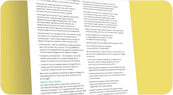 THE UNITE GROUP PLC Annual Report and Accounts 2024 70 STRATEGIC REPORT and updated scenarios using the latest data from the Met Office, ensuring the analysis reflects current scientific understanding. The process for assessing climate risks follows the same approach as for all principal risks, with the Board responsible. These are detailed in the Summary of principal risks and uncertainties tables on page 60. The Energy and Environment Team integrates sustainability into the business, tracking climate, legal, and policy developments to manage associated risks. This includes adhering to MEES regulations for EPC standards and developing transition plans for assets to meet future standards. We monitor regulatory requirements, including climate change, to ensure compliance with new regulations. Climate-related risks and opportunities are assessed through due diligence for investments and risk assessments for existing assets. These include energy efficiency ratings and physical climate risks, detailed in Asset Transition Plans: • Existing assets – Risks are identified by analysing property data, such as flood risk, transition risk using CRREM tool outputs, and energy performance, typically reviewed annually to inform asset management and disposal strategies. • Investment and divestment – The Investment Committee reviews sustainability risks, considering geographical location for physical risks like flooding and overheating. • Transition risks are assessed based on energy efficiency ratings, plant and machinery, construction type, and investment needed to meet net zero targets. When risks are identified, we develop mitigation strategies for new developments or adjust acquisition pricing if risk can be managed. METRICS AND TARGETS Our 2030 net zero carbon commitment, outlined in our 2021 Net Zero Pathway, aligns with the Paris Agreement and UK Government goals. This is supported by SBTi-approved science-based targets and our RE100 pledge to purchase 100% renewable electricity by 2030. Senior leadership’s long-term incentive plan is linked to energy intensity, and Executive bonuses are tied to GRESB, which includes net zero transition and sustainability performance. Focusing on net zero helps reduce physical risks from overheating and flooding, maintains reputational integrity, and ensures the use of best available technology to achieve credible and achievable transition plans. As we offer all-inclusive rent, including the cost of utilities, our customers’ energy use is included in our Scope 1 & 2 emissions, providing an opportunity to reduce both our and their environmental impact. This is unlike most real estate businesses where tenant energy use contributes to Scope 3 emissions. Our Net Zero Carbon Pathway includes ambitious climate-related targets: • Reduce absolute carbon emissions (Scope 1 and market-based Scope 2) by 56% by 2030 from a 2019 baseline (SBTi validated) • Achieve 625kgCO2e/m2 of embodied carbon or new developments by 2030, in line with the RIBA 2030 climate challenge • Reduce energy intensity by 28% by 2030 compared to 2019 • Source 100% of energy from renewable sources by 2030, in line with RE100. We are undertaking a number of actions in 2025 to ensure that we continue to progress towards our net zero goal and mitigate climate risks: • c.£12 million of capital investment in energy efficiency planned for 2025, including LED lighting, air source heat pumps and improved heating controls • Exploring options to expand our electricity Power Purchase Agreements to meaningfully decarbonise our energy supply • Climate-related metrics are included in Company bonus and incentive schemes as set out in the Governance section of this disclosure • We continue to explore internal carbon pricing options and expect them to form part of our updated Net Zero Carbon Pathway. Energy consumption and Scope 1 & 2 greenhouse gas emissions, calculated in line with the Greenhouse Gas Protocol, have been externally verified by SGS to a reasonable level of assurance in line with the requirements of ISO 14064-3:2019. Environmental performance data has undergone external assurance by SGS to a limited level of assurance in line with requirements of ISAE 3000 (Revised): Assurance Engagements Other than Audits or Reviews of Historical Financial Information. RISK MANAGEMENT continued