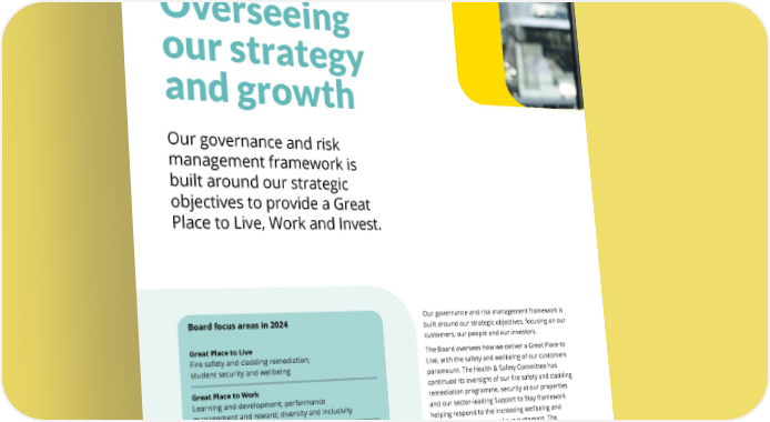 THE UNITE GROUP PLC Annual Report and Accounts 2024 74 Our governance and risk management framework is built around our strategic objectives, focusing on our customers, our people and our investors. The Board oversees how we deliver a Great Place to Live, with the safety and wellbeing of our customers paramount. The Health & Safety Committee has continued its oversight of our fire safety and cladding remediation programme, security at our properties and our sector-leading Support to Stay framework helping respond to the increasing wellbeing and mental health concerns of our customers. The Board has also continued to oversee the ongoing investment in our best-in-class operating platform, with the roll out in 2024 of our new customer app and website. We continue to look to drive efficiencies through our scale and technology platform, with a Board focus on ensuring we deliver high quality and affordable homes for our customers. CHAIR’S INTRODUCTION TO GOVERNANCE Overseeing our strategy and growth Our governance and risk management framework is built around our strategic objectives to provide a Great Place to Live, Work and Invest. GOVERNANCE Board focus areas in 2024 Great Place to Live Fire safety and cladding remediation; student security and wellbeing Great Place to Work Learning and development; performance management and reward; diversity and inclusivity Great Place to Invest Development pipeline in strongest markets; Newcastle and other prospective university joint ventures; disposals; responsible and sustainable landlord