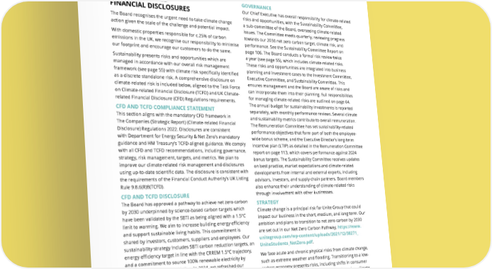 THE UNITE GROUP PLC Annual Report and Accounts 2024 63 GOVERNANCE Our Chief Executive has overall responsibility for climate-related risks and opportunities, with the Sustainability Committee, a sub-committee of the Board, overseeing climate-related issues. The Committee meets quarterly, reviewing progress towards our 2030 net zero carbon target, climate risk, and performance. See the Sustainability Committee Report on page 106. The Board conducts a formal risk review twice a year (see page 55), which includes climate-related risks. These risks and opportunities are integrated into business planning and investment cases to the Investment Committee, Executive Committee, and Sustainability Committee. This ensures management and the Board are aware of risks and can incorporate them into their planning. Full responsibilities for managing climate-related risks are outlined on page 64. The annual budget for sustainability investments is reported separately, with monthly performance reviews. Several climate and sustainability metrics contribute to overall remuneration. The Remuneration Committee has set sustainability-related performance objectives that form part of both the employee- wide bonus scheme, and the Executive Director’s long-term incentive plan (LTIP) as detailed in the Remuneration Committee report on page 113, which covers performance against 2024 bonus targets. The Sustainability Committee receives updates on best practice, market expectations and climate-related developments from internal and external experts, including advisors, investors, and supply chain partners. Board members also enhance their understanding of climate-related risks through involvement with other businesses. STRATEGY Climate change is a principal risk for Unite Group that could impact our business in the short, medium, and long term. Our ambition and plans to transition to net zero carbon by 2030 are set out in our Net Zero Carbon Pathway, https://www. unitegroup.com/wp-content/uploads/2021/12/38271_ UniteStudents_NetZero.pdf. We face acute and chronic physical risks from climate change, such as extreme weather and flooding. Transitioning to a low- carbon economy presents risks, including shifts in consumer preferences, impacts on property valuations based on climate resilience and energy performance, and evolving regulations. These challenges also present opportunities, as our sector leadership may enhance financial performance and lead to benefits such as reduced winter heating due to climate change effects. All our assets are in the UK, so only UK-specific physical risks are considered. The risk mangement process is detailed in the Risk Management section on page 54. CLIMATE-RELATED FINANCIAL DISCLOSURES The Board recognises the urgent need to take climate change action given the scale of the challenge and potential impact. With domestic properties responsible for c.25% of carbon emissions in the UK, we recognise our responsibility to minimise our footprint and encourage our customers to do the same. Sustainability presents risks and opportunities which are managed in accordance with our overall risk management framework (see page 55) with climate risk specifically identified as a discrete standalone risk. A comprehensive disclosure on climate-related risk is included below, aligned to the Task Force on Climate-related Financial Disclosure (TCFD) and UK Climate- related Financial Disclosure (CFD) Regulations requirements. CFD AND TCFD COMPLIANCE STATEMENT This section aligns with the mandatory CFD framework in The Companies (Strategic Report) (Climate-related Financial Disclosure) Regulations 2022. Disclosures are consistent with Department for Energy Security & Net Zero’s mandatory guidance and HM Treasury’s TCFD-aligned guidance. We comply with all CFD and TCFD recommendations, including governance, strategy, risk management, targets, and metrics. We plan to improve our climate-related risk management and disclosures using up-to-date scientific data. The disclosure is consistent with the requirements of the Financial Conduct Authority’s UK Listing Rule 9.8.6(R)8(TCFD). CFD AND TCFD DISCLOSURE The Board has approved a pathway to achieve net zero carbon by 2030 underpinned by science-based carbon targets which have been validated by the SBTi as being aligned with a 1.5°C limit to warming. We aim to increase building energy efficiency and support sustainable living habits. This commitment is shared by investors, customers, suppliers and employees. Our sustainability strategy includes SBTi carbon reduction targets, an energy efficiency target in line with the CRREM 1.5°C trajectory, and a commitment to source 100% renewable electricity by 2030 under the RE100 initiative. In 2024, we refreshed our climate scenario analysis to prepare for and mitigate climate impacts while identifying opportunities. Our Net Zero Carbon Pathway, part of the TCFD Strategy (b) disclosures, is on our website. Since 2020, we have engaged with stakeholders to focus on climate-related critical issues and report accordingly. In 2024, we updated investors on our climate performance and priorities, incorporating their feedback into our sustainability strategy. The Board also considers feedback from students, universities, employees, and local communities to ensure focus on material issues.