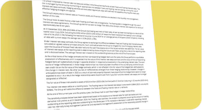 THE UNITE GROUP PLC Annual Report and Accounts 2024 190 FINANCIAL STATEMENTS 4.5 Financial risk factors The Group’s activities expose it to a variety of financial risks: market risks (primarily interest rate risk), credit risk and liquidity risk. The Group’s Treasury Policy focuses on the unpredictability of financial markets and seeks to minimise potential adverse effects on the Group’s financial performance. Details on credit risk can be found in note 5.3. 4.5a) Interest rate risk The Group is exposed to interest rate risk because entities in the Group borrow funds at both fixed and floating interest rates. The risk is managed by the Group by maintaining an appropriate mix between fixed and floating rate borrowings, and by the use of interest rate swap contracts. Hedging activities are evaluated regularly to align with defined risk appetite; ensuring the most cost- effective hedging strategies are applied. The Group’s exposures to interest rates on financial assets and financial liabilities are detailed in the liquidity risk management section of this note. The Group holds its debt finance under both floating and fixed rate arrangements. The floating debt is hedged through the use of interest rate swap agreements. The Group’s guideline has been to hedge 75%–95% of the Group’s interest rate exposure for terms of approximately two to ten years. At 31 December 2024, 89% (2023:96% of the Group’s borrowing was held at fixed rates, driven by lower borrowings as a result of the capital raise in July 2024. Excluding the £450 million (2023: £200 million) of swaps the fixed investment borrowing is at an average rate of 4.1% (2023: 3.1%) following the new bond issuance in June 2024 for an average period of 5.8 years (2023: 4.4 years), including all debt with current swaps the average rate is 3.3% (2023: 2.9%). Under interest rate swap contracts, the Group agrees to exchange the difference between fixed and floating rate interest amounts calculated on agreed notional principal amounts. Such contracts enable the Group to mitigate the risk of changing interest rates upon the issuance of forecast fixed rate debt held and the cash flow exposures on the issued variable rate debt held. The fair value of interest rate swaps at the reporting date is determined by discounting the future cash flows using the curves at the reporting date and is disclosed below. The average interest rate is based on the outstanding balances at the end of the financial year. As the critical terms of the hedge contracts and their corresponding hedged items are the same, the Group performs a qualitative assessment of effectiveness and it is expected that the value of the interest rate swap contracts and the value of the corresponding hedged items will systematically change in opposite direction in response to movements in the underlying interest rates. The main source of hedge ineffectiveness in these hedge relationships has historically been the effect of the counterparty and the Group’s own credit risk on the fair value of the hedge contracts, which is not reflected in the fair value of the hedged item attributable to the change in interest rates. No other sources of ineffectiveness emerged from these hedging relationships. However, changes in anticipated draw down of debt in 2022 as a result of planned property disposals have meant that the hedged items were no longer expected to occur. As a result the hedge relationships were discontinued from 1 July 2021 and the interest rate swaps are no longer designated as ‘effective’. The fair value of these instruments is assets of £53.4 million (2023: £56.0 million) with £7.4 million maturing in 12 months (2023: £nil). The interest rate swaps settle on a monthly basis. The floating rate on the interest rate swaps is one-month SONIA (2023: one-month SONIA). The Group will settle the difference between the fixed and floating interest rate on a net basis. At the end of the current year and the previous year, the Group had no cash flow hedges in hedge relationships. The sensitivity analyses below have been determined based on the exposure to interest rates for both derivative and non- derivative instruments as at 31 December 2024. For floating rate liabilities, the analysis is prepared assuming the amount of liability outstanding at the reporting date was outstanding for the whole year. A 1% increase or decrease is used when reporting interest rate risk internally to key management personnel and represents management’s assessment of the reasonably possible change in interest rates. If interest rates had been 1% higher and all other variables were held constant the Group’s profit for the year ended. As the notional value of the interest rate swap contracts is greater than the amount of borrowing at variable rate, the Group is exposed to fluctuations in interest rates. If interest rates had been 1% higher and all other variables were held constant the Group’s profit for the year ended 31 December 2024 would increase by £3.7 million (2023: £1.7 million). There would be with no impact directly recognised in the Statement of Changes in Equity. The Group’s sensitivity to interest rates has remained reasonably consistent year-on-year. NOTES TO THE FINANCIAL STATEMENTS continued