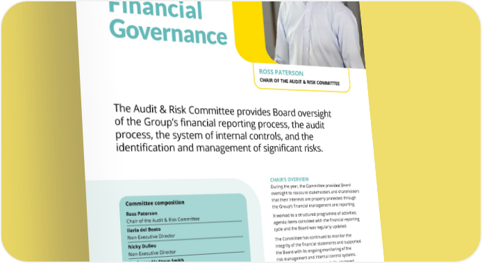 THE UNITE GROUP PLC Annual Report and Accounts 2024 101 AUDIT & RISK COMMITTEE Financial Governance The Audit & Risk Committee provides Board oversight of the Group’s financial reporting process, the audit process, the system of internal controls, and the identification and management of significant risks. CHAIR’S OVERVIEW During the year, the Committee provided Board oversight to reassure stakeholders and shareholders that their interests are properly protected through the Group’s financial management and reporting. It worked to a structured programme of activities; agenda items coincided with the financial reporting cycle and the Board was regularly updated. The Committee has continued to monitor the integrity of the financial statements and supported the Board with its ongoing monitoring of the risk management and internal control systems. It determined internal audit activity, reviewed findings and considered progress by management in implementing recommendations. It challenged the approach to assess the Group’s ability to continue as a going concern and its loan covenant compliance, by reviewing various scenarios for future performance. Committee composition Ross Paterson Chair of the Audit & Risk Committee Ilaria del Beato Non-Executive Director Nicky Dulieu Non-Executive Director Professor Sir Steve Smith Non-Executive Director ROSS PATERSON CHAIR OF THE AUDIT & RISK COMMITTEE