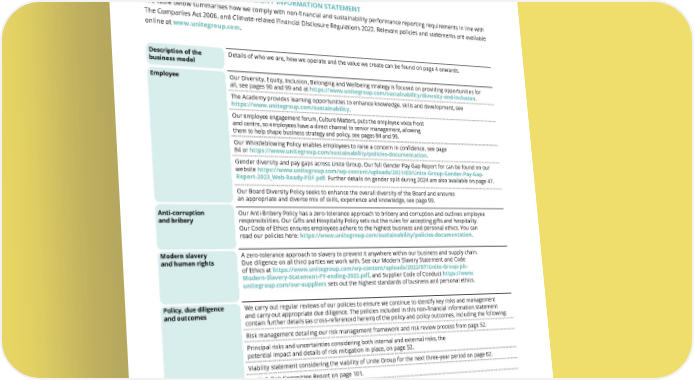 THE UNITE GROUP PLC Annual Report and Accounts 2024 46 STRATEGIC REPORT PERFORMANCE REVIEW Sustainability continued Description of the business model Details of who we are, how we operate and the value we create can be found on page 4 onwards. Employee Our Diversity, Equity, Inclusion, Belonging and Wellbeing strategy is focused on providing opportunities for all, see pages 90 and 99 and at https://www.unitegroup.com/sustainability/diversity-and-inclusion. The Academy provides learning opportunities to enhance knowledge, skills and development, see https://www.unitegroup.com/sustainability. Our employee engagement forum, Culture Matters, puts the employee voice front and centre, so employees have a direct channel to senior management, allowing them to help shape business strategy and policy, see pages 84 and 99. Our Whistleblowing Policy enables employees to raise a concern in confidence, see page 84 or https://www.unitegroup.com/sustainability/policies-documentation. Gender diversity and pay gaps across Unite Group. Our full Gender Pay Gap Report for can be found on our website https://www.unitegroup.com/wp-content/uploads/2021/03/Unite-Group-Gender-Pay-Gap- Report-2023_Web-Ready-PDF.pdf. Further details on gender split during 2024 are also available on page 47. Our Board Diversity Policy seeks to enhance the overall diversity of the Board and ensures an appropriate and diverse mix of skills, experience and knowledge, see page 99. Anti-corruption and bribery Our Anti-Bribery Policy has a zero-tolerance approach to bribery and corruption and outlines employee responsibilities. Our Gifts and Hospitality Policy sets out the rules for accepting gifts and hospitality. Our Code of Ethics ensures employees adhere to the highest business and personal ethics. You can read our policies here: https://www.unitegroup.com/sustainability/policies-documentation. Modern slavery and human rights A zero-tolerance approach to slavery to prevent it anywhere within our business and supply chain. Due diligence on all third parties we work with. See our Modern Slavery Statement and Code of Ethics at https://www.unitegroup.com/wp-content/uploads/2022/07/Unite-Group-plc- Modern-Slavery-Statement-FY-ending-2022.pdf, and Supplier Code of Conduct https://www. unitegroup.com/our-suppliers sets out the highest standards of business and personal ethics. Policy, due diligence and outcomes We carry out regular reviews of our policies to ensure we continue to identify key risks and management and carry out appropriate due diligence. The policies included in this non-financial information statement contain further details (as cross-referenced herein) of the policy and policy outcomes, including the following: Risk management detailing our risk management framework and risk review process from page 52. Principal risks and uncertainties considering both internal and external risks, the potential impact and details of risk mitigation in place, on page 52. Viability statement considering the viability of Unite Group for the next three-year period on page 62. Audit & Risk Committee Report on page 101. Sustainability Committee Report on page 106. Unite Group Health & Safety Committee Report page 108 and Health and Safety Policy (and https:// www.unitegroup.com/sustainability/policies-documentation) which details Unite Group’s commitment to the health and safety of our employees, students and visitors to our sites. Non-financial KPIs relevant to the Company’s business on page 17 and https://www.unitegroup.com/sustainability. NON-FINANCIAL AND SUSTAINABILITY INFORMATION STATEMENT The table below summarises how we comply with non-financial and sustainability performance reporting requirements in line with The Companies Act 2006, and Climate-related Financial Disclosure Regulations 2022. Relevant policies and statements are available online at www.unitegroup.com.