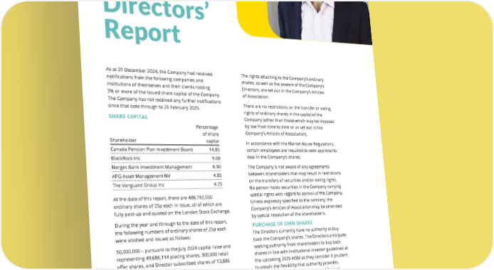 THE UNITE GROUP PLC Annual Report and Accounts 2024 138 GOVERNANCE The rights attaching to the Company’s ordinary shares, as well as the powers of the Company’s Directors, are set out in the Company’s Articles of Association. There are no restrictions on the transfer or voting rights of ordinary shares in the capital of the Company (other than those which may be imposed by law from time to time or as set out in the Company’s Articles of Association). In accordance with the Market Abuse Regulations, certain employees are required to seek approval to deal in the Company’s shares. The Company is not aware of any agreements between shareholders that may result in restrictions on the transfers of securities and/or voting rights. No person holds securities in the Company carrying special rights with regard to control of the Company. Unless expressly specified to the contrary, the Company’s Articles of Association may be amended by special resolution of the shareholders. PURCHASE OF OWN SHARES The Directors currently have no authority to buy back the Company’s shares. The Directors anticipate seeking authority from shareholders to buy back shares in line with institutional investor guidelines at the upcoming 2025 AGM as they consider it prudent to obtain the flexibility that authority provides. Details will be included in the Notice of Annual General Meeting. AUTHORITY TO ISSUE SHARES The Directors may only issue shares if authorised to do so by the Articles of Association or the shareholders in general meeting. At the Company’s Annual General Meeting held on 16 May 2024, shareholders granted an authority to the Directors As at 31 December 2024, the Company had received notifications from the following companies and institutions of themselves and their clients holding 3% or more of the issued share capital of the Company. The Company has not received any further notifications since that date through to 25 February 2025. SHARE CAPITAL Shareholder Percentage of share capital Canada Pension Plan Investment Board 14.85 BlackRock Inc 9.68 Norges Bank Investment Management 8.90 APG Asset Management NV 4.85 The Vanguard Group Inc 4.25 At the date of this report, there are 488,792,550 ordinary shares of 25p each in issue, all of which are fully paid-up and quoted on the London Stock Exchange. During the year and through to the date of this report, the following numbers of ordinary shares of 25p each were allotted and issued as follows: 50,000,000 – pursuant to the July 2024 capital raise and representing 49,686,114 placing shares, 300,000 retail offer shares, and Director subscribed shares of 13,886 at a price of 924 pence per share 2,808,461 – Unite share scrip scheme 32,086 – pursuant to the exercise of options under Unite Group PLC Savings Related Share Option Scheme 102,901 – pursuant to the exercise of options under Unite Group PLC Performance Share Plan. DIRECTORS’ REPORT Directors’ Report