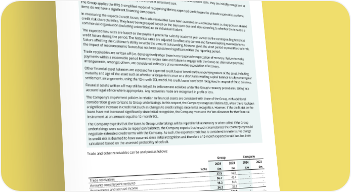 THE UNITE GROUP PLC Annual Report and Accounts 2024 197 5.2 Trade and other receivables Accounting policies On the basis that trade receivables meet the business model and cash flow characteristics tests, they are initially recognised at transaction price and then subsequently measured at amortised cost. The Group applies the IFRS 9 simplified model of recognising lifetime expected credit losses for all trade receivables as these items do not have a significant financing component. In measuring the expected credit losses, the trade receivables have been assessed on a collective basis as they possess shared credit risk characteristics. They have been grouped based on the days past due and also according to whether the tenant is a commercial organisation (including universities) or an individual student. The expected loss rates are based on the payment profile for sales by academic year as well as the corresponding historical credit losses during the period. The historical rates are adjusted to reflect any current and forward-looking macroeconomic factors affecting the customer’s ability to settle the amount outstanding, however given the short period exposed to credit risk, the impact of macroeconomic factors has not been considered significant within the reporting period. Trade receivables are written off (i.e. derecognised) when there is no reasonable expectation of recovery. Failure to make payments within a reasonable period from the invoice date and failure to engage with the Group on alternative payment arrangements, amongst others, are considered indicators of no reasonable expectation of recovery. Other financial asset balances are assessed for expected credit losses based on the underlying nature of the asset, including maturity and age of the asset such as whether a longer-term asset or a short-term working capital balance is subject to regular settlement arrangements, using the 12-month ECL model. No credit losses have been recognised in respect of these balances. Financial assets written off may still be subject to enforcement activities under the Group’s recovery procedures, taking into account legal advice where appropriate. Any recoveries made are recognised in profit or loss. The Company’s impairment policies in relation to financial assets are consistent with those of the Group, with additional consideration given to loans to Group undertakings. In this respect, the Company recognises lifetime ECL when there has been a significant increase in credit risk (such as changes to credit ratings) since initial recognition. However, if the credit risk on the loans have not increased significantly since initial recognition, the Company measures the loss allowance for that financial instrument at an amount equal to 12-month ECL. The Company expects that the loans to Group undertakings will be repaid in full at maturity or when called. If the Group undertakings were unable to repay loan balances, the Company expects that in such circumstances the counterparty would negotiate extended credit terms with the Company. As such, the expected credit loss is considered immaterial. No change in credit risk is deemed to have occurred since initial recognition and therefore a 12-month expected credit loss has been calculated based on the assessed probability of default. Trade and other receivables can be analysed as follows: Group Company Note 2024 2023 2024 2023 £m £m £m £m Trade receivables 37.5 34.8 - - Amounts owed by joint ventures 56.7 49.4 - - Prepayments and accrued income 16.2 14.8 - - Other receivables 34.2 33.8 - - Trade and other receivables 144.6 132.8 - - Loans to Group undertakings (non-current) 5.6 - - 3,416.1 2,130.0 Trade and other receivables (non-current) - - 3,416.1 2,130.0 The Group offers tenancy contracts to commercial (universities and retail unit tenants) and individual tenants based on the academic year. The Group monitors and manages the recoverability of its receivables based on the academic year to which the amounts relate. Rental income is payable immediately, therefore all receivables relating to tenants are past the payment due date.