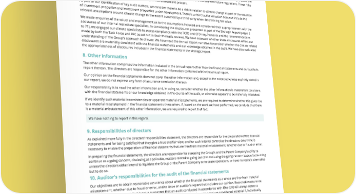 THE UNITE GROUP PLC Annual Report and Accounts 2024 149 7.3. Our consideration of climate-related risks We have made enquiries of management to understand the processes in place to assess the potential impact of climate change on the business and the financial statements. Management consider climate change to be a principal risk which particularly impacts the cost of retrofitting rental accommodation to improve their sustainability credentials and comply with future regulations. These risks are consistent with those identified through our own risk assessment process. As part of our identification of key audit matters, we consider there to be a risk in relation to climate change as part of the valuation of investment properties and investment properties under development. There is a risk that the valuation does not include the relevant assumptions around climate change to the extent assumed by a third party when determining fair value. We made enquiries of the valuer and management as to the assumptions included and considered their appropriateness with the assistance of our internal real estate specialists. In considering the disclosures presented as part of the Strategic Report (pages 2 to 71), we engaged our climate specialists to assess compliance with the TCFD and CFD requirements and the recommendations made by both the Task Force and FRC as set out in their thematic reviews. We have assessed whether these disclosures reflect our understanding of the Group’s approach to climate. We have read the Annual Report narrative to consider whether the climate related disclosures are materially consistent with the financial statements and our knowledge obtained in the audit. We have also evaluated the appropriateness of disclosures included in the financial statements in the strategic report. 8. Other information The other information comprises the information included in the annual report other than the financial statements and our auditor’s report thereon. The directors are responsible for the other information contained within the annual report. Our opinion on the financial statements does not cover the other information and, except to the extent otherwise explicitly stated in our report, we do not express any form of assurance conclusion thereon. Our responsibility is to read the other information and, in doing so, consider whether the other information is materially inconsistent with the financial statements or our knowledge obtained in the course of the audit, or otherwise appears to be materially misstated. If we identify such material inconsistencies or apparent material misstatements, we are required to determine whether this gives rise to a material misstatement in the financial statements themselves. If, based on the work we have performed, we conclude that there is a material misstatement of this other information, we are required to report that fact. We have nothing to report in this regard. 9. Responsibilities of directors As explained more fully in the directors’ responsibilities statement, the directors are responsible for the preparation of the financial statements and for being satisfied that they give a true and fair view, and for such internal control as the directors determine is necessary to enable the preparation of financial statements that are free from material misstatement, whether due to fraud or error. In preparing the financial statements, the directors are responsible for assessing the Group’s and the Parent Company’s ability to continue as a going concern, disclosing as applicable, matters related to going concern and using the going concern basis of accounting unless the directors either intend to liquidate the Group or the Parent Company or to cease operations, or have no realistic alternative but to do so. 10. Auditor’s responsibilities for the audit of the financial statements Our objectives are to obtain reasonable assurance about whether the financial statements as a whole are free from material misstatement, whether due to fraud or error, and to issue an auditor’s report that includes our opinion. Reasonable assurance is a high level of assurance, but is not a guarantee that an audit conducted in accordance with ISAs (UK) will always detect a material misstatement when it exists. Misstatements can arise from fraud or error and are considered material if, individually or in the aggregate, they could reasonably be expected to influence the economic decisions of users taken on the basis of these financial statements. A further description of our responsibilities for the audit of the financial statements is located on the FRC’s website at: www.frc.org.uk/auditorsresponsibilities. This description forms part of our auditor’s report.