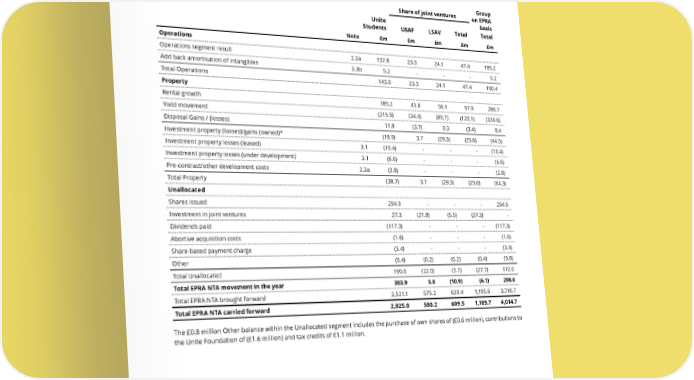 THE UNITE GROUP PLC Annual Report and Accounts 2024 165 2.3b) Movement in EPRA NTA during the year continued 2023 Share of joint ventures Group on EPRA basis Unite Students USAF LSAV Total Total Note £m £m £m £m £m Operations Operations segment result 2.2a 137.8 23.3 24.1 47.4 185.2 Add back amortisation of intangibles 3.3b 5.2 - - - 5.2 Total Operations 143.0 23.3 24.1 47.4 190.4 Property Rental growth 185.2 41.8 56.1 97.9 286.7 Yield movement (215.9) (34.4) (85.7) (120.1) (339.6) Disposal Gains / (losses) 11.8 (3.7) 0.3 (3.4) 8.4 Investment property (losses)/gains (owned)* (18.9) 3.7 (29.3) (25.6) (44.5) Investment property losses (leased) 3.1 (10.4) - - - (10.4) Investment property losses (under development) 3.1 (6.6) - - - (6.6) Pre-contract/other development costs 2.2a (2.8) - - - (2.8) Total Property (38.7) 3.7 (29.3) (25.6) (64.3) Unallocated Shares issued 294.9 - - - 294.9 Investment in joint ventures 27.3 (21.8) (5.5) (27.3) - Dividends paid (117.3) - - - (117.3) Abortive acquisition costs (1.6) - - - (1.6) Share-based payment charge (3.4) - - - (3.4) Other (0.4) (0.2) (0.2) (0.4) (0.8) Total Unallocated 199.6 (22.0) (5.7) (27.7) 172.0 Total EPRA NTA movement in the year 303.9 5.0 (10.9) (6.1) 298.0 Total EPRA NTA brought forward 2,521.1 575.2 620.4 1,195.6 3,716.7 Total EPRA NTA carried forward 2,825.0 580.2 609.5 1,189.7 4,014.7 The £0.8 million Other balance within the Unallocated segment includes the purchase of own shares of (£0.6 million), contributions to the Unite Foundation of (£1.6 million) and tax credits of £1.1 million.