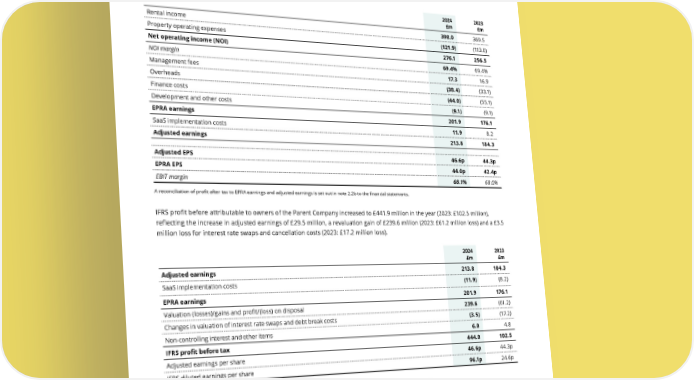 STRATEGIC REPORT PERFORMANCE REVIEW Financial review continued THE UNITE GROUP PLC Annual Report and Accounts 2024 36 2024 £m 2023 £m Adjusted earnings 213.8 184.3 SaaS implementation costs (11.9) (8.2) EPRA earnings 201.9 176.1 Valuation (losses)/gains and profit/(loss) on disposal 239.6 (61.2) Changes in valuation of interest rate swaps and debt break costs (3.5) (17.2) Non-controlling interest and other items 6.0 4.8 IFRS profit before tax 444.0 102.5 Adjusted earnings per share 46.6p 44.3p IFRS diluted earnings per share 96.1p 24.6p A reconciliation of profit before tax to adjusted earnings and EPRA earnings is expanded in section 7 of the financial statements. 2024 £m 2023 £m Rental income 398.0 369.5 Property operating expenses (121.9) (113.0) Net operating income (NOI) 276.1 256.5 NOI margin 69.4% 69.4% Management fees 17.3 16.9 Overheads (38.4) (33.1) Finance costs (44.0) (55.1) Development and other costs (9.1) (9.1) EPRA earnings 201.9 176.1 SaaS implementation costs 11.9 8.2 Adjusted earnings 213.8 184.3 Adjusted EPS 46.6p 44.3p EPRA EPS 44.0p 42.4p EBIT margin 68.1% 68.0% A reconciliation of profit after tax to EPRA earnings and adjusted earnings is set out in note 2.2b to the financial statements. IFRS profit before attributable to owners of the Parent Company increased to £441.9 million in the year (2023: £102.5 million), reflecting the increase in adjusted earnings of £29.5 million, a revaluation gain of £239.6 million (2023: £61.2 million loss) and a £3.5 million loss for interest rate swaps and cancellation costs (2023: £17.2 million loss). RENTAL GROWTH AND PROFITABILITY Rental income increased by £28.5 million to £398.0 million, up 8% compared to 2023. Like-for-like rental income, excluding the impact of major refurbishments, acquisitions, disposals and development completions, increased by 8% during the year reflecting strong rental growth but modestly lower occupancy for the 2024/25 academic year. Non-like- for-like income grew by £4.3 million with additional rentol income from acquisitions and development completions exceeding the impact of income forgone through disposals. Operating expenses increased by 6% for like-for- like properties, primarily driven by increased utility and staff costs due to the expiry of cheaper utility hedges and increases in the Real Living Wage. This resulted in an 8% increase in net operating income to £276.1 million (2023: £256.5 million) or 8% on a like-for-like basis.