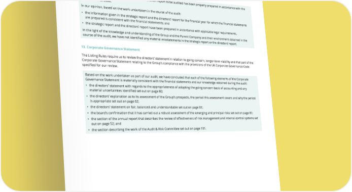 THE UNITE GROUP PLC Annual Report and Accounts 2024 151 Report on other legal and regulatory requirements 12. Opinions on other matters prescribed by the Companies Act 2006 In our opinion, the part of the directors’ remuneration report to be audited has been properly prepared in accordance with the Companies Act 2006. In our opinion, based on the work undertaken in the course of the audit: • the information given in the strategic report and the directors’ report for the financial year for which the financial statements are prepared is consistent with the financial statements; and • the strategic report and the directors’ report have been prepared in accordance with applicable legal requirements. In the light of the knowledge and understanding of the Group and the Parent Company and their environment obtained in the course of the audit, we have not identified any material misstatements in the strategic report or the directors’ report. 13. Corporate Governance Statement The Listing Rules require us to review the directors’ statement in relation to going concern, longer-term viability and that part of the Corporate Governance Statement relating to the Group’s compliance with the provisions of the UK Corporate Governance Code specified for our review. Based on the work undertaken as part of our audit, we have concluded that each of the following elements of the Corporate Governance Statement is materially consistent with the financial statements and our knowledge obtained during the audit: • the directors’ statement with regards to the appropriateness of adopting the going concern basis of accounting and any material uncertainties identified set out on page 80; • the directors’ explanation as to its assessment of the Group’s prospects, the period this assessment covers and why the period is appropriate set out on page 62; • the directors’ statement on fair, balanced and understandable set out on page 81; • the board’s confirmation that it has carried out a robust assessment of the emerging and principal risks set out on page 81; • the section of the annual report that describes the review of effectiveness of risk management and internal control systems set out on page 52; and • the section describing the work of the Audit & Risk Committee set out on page 101.