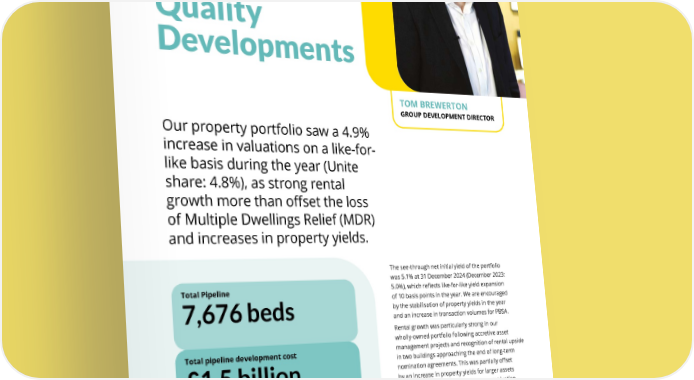 THE UNITE GROUP PLC Annual Report and Accounts 2024 29 TOM BREWERTON GROUP DEVELOPMENT DIRECTOR The see-through net initial yield of the portfolio was 5.1% at 31 December 2024 (December 2023: 5.0%), which reflects like-for-like yield expansion of 10 basis points in the year. We are encouraged by the stabilisation of property yields in the year and an increase in transaction volumes for PBSA. Rental growth was particularly strong in our wholly-owned portfolio following accretive asset management projects and recognition of rental upside in two buildings approaching the end of long-term nomination agreements. This was partially offset by an increase in property yields for larger assets in prime regional markets. The stronger valuation performance for LSAV reflects its higher London weighting, where the loss of MDR was less impactful. Our property portfolio saw a 4.9% increase in valuations on a like-for- like basis during the year (Unite share: 4.8%), as strong rental growth more than offset the loss of Multiple Dwellings Relief (MDR) and increases in property yields. Total Pipeline 7,676 beds Total pipeline development cost £1.5 billion (2023: £1.3bn) Beds nominated by university partners 57% (2023: 53%) PERFORMANCE REVIEW Property review Quality Developments