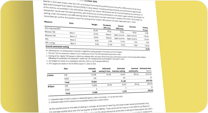 THE UNITE GROUP PLC Annual Report and Accounts 2024 130 2022 LTIP vesting (vested on performance to 31 December 2024) Awards in 2022 were made under the LTIP, consisting of the Unite Group Performance Share Plan (PSP) and the Unite Group Approved Employee Share Option Scheme (ESOS). Further details, including vesting schedules and performance against each of the metrics, are provided in the table below. Vesting of the relative TAR element will be finalised following the publication of comparator results over the coming months, with Unite Group currently estimated to rank above upper quartile, equating to full vesting under this element, and 64% vesting overall. No discretion has been exercised in respect of the 2022 LTIP to-date; the Committee will confirm this position once final vesting of the relative TAR element has been approved later in 2025. Measure Note Weight Threshold 25% max. Stretch 100% max. Outcome Vesting % max. 2024 Adjusted EPS 28.0% 48.5p 53.6p 46.6p 0.0% Relative TSR Note 1 28.0% Median Upper quartile Upper quartile 100.0% Relative TAR Note 1,2 28.0% Median Upper quartile Upper quartile 100.0% OEI Note 3 8.0% 6.3% 12.6% 1.6% 0.0% EPC ratings Note 4 8.0% 67.0% 79.0% 100% 100.0% Overall estimated vesting 64.0% For all measures: no vesting below Threshold; straight-line vesting between Threshold and Stretch targets. 1. TSR and TAR are measured relative to the constituents of the FTSE 350 Real Estate Supersector Index. 2. Vesting of the relative TAR measure reflects an estimate after two years of the three-year performance period. Actual vesting will be finalised following the publication of comparator results over the coming months and detailed in next year’s report. 3. OEI targets are based on a cumulative reduction: 2024 vs. 2019 baseline (kWh/m2). 4. EPC targets are based on the % of floorspace A-C rated in 2024. 5. Estimated value of ESOS is based on embedded gain (i.e. after subtracting 1,121.0p exercise price). 6. Estimated value of PSP includes the accumulated dividends on vested shares. Plan Interests held Estimated vesting % max. Estimated interests vesting Assumed market price Estimated value Note 5,6 J Lister PSP 73,288 64.0% 46,904 869.9p £453,103 ESOS 535 342 £0 Total 73,823 47,246 £453,103 M Burt PSP 13,093 64.0% 8,379 869.9p £80,943 ESOS 0 0 £0 Total 13,093 8,379 £80,943 As the market price on the date of vesting is unknown at the time of reporting, the values shown above are estimated using the average market value over the last quarter of 2024 of 869.9p. These values will be trued-up in the 2025 Annual Report on Remuneration to reflect actual relative TAR vesting and the actual share price at the date of vesting for these awards. Joe Lister’s awards are subject to a mandatory two-year holding period following vesting; Mike Burt’s awards were granted in respect of his previous role and accordingly an additional holding period will not apply. None of the estimated values shown is attributable to share price appreciation, with the market price used in these calculations (869.9p) being 22.4% lower than the share price at grant (1,121.0p). Executives also became entitled to additional shares representing the dividends payable on vested PSP shares over the three- year performance period. The estimated additional value of these shares is included in the relevant rows above and in the single total figures of remuneration table on page 128 and equate to £45,075 and £8,052 for Joe Lister and Mike Burt respectively. Actual dividends payable will be determined on finalising vesting of the TAR element of awards. ANNUAL REPORT ON REMUNERATION continued GOVERNANCE