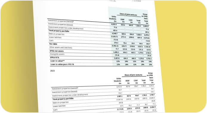 THE UNITE GROUP PLC Annual Report and Accounts 2024 163 2.3 Net assets 2.3a) EPRA NTA EPRA NTA makes adjustments to IFRS measures by removing the fair value of financial instruments and the carrying value of intangibles. The reconciliation between IFRS NAV and EPRA NTA is available in note 2.3c. 2024 Share of joint ventures Group on EPRA basis Unite Students USAF LSAV Total Total £m £m £m £m £m Investment properties (owned)* 4,025.5 829.6 996.9 1,826.5 5,852.0 Investment properties (leased) 71.8 - - - 71.8 Investment properties under development 451.4 - - - 451.4 Total property portfolio 4,548.7 829.6 996.9 1,826.5 6,375.2 Debt on properties (1,263.7) (273.1) (338.0) (611.1) (1,874.8) Lease liabilities (72.8) - - - (72.8) Cash 274.3 70.4 20.0 90.4 364.7 Net debt (1,062.2) (202.7) (318.0) (520.7) (1,582.9) Other assets and (liabilities) 11.7 (22.6) (12.6) (35.2) (23.5) EPRA net assets 3,498.2 604.3 666.3 1,270.6 4,768.8 Intangible assets (10.4) - - - (10.4) EPRA NTA 3,487.8 604.3 666.3 1,270.6 4,758.4 Loan to value** 22% 24% 32% 29% 24% Loan to value post-IFRS 16 23% 24% 32% 29% 25% 2023 Share of joint ventures Group on EPRA basis Unite Students USAF LSAV Total Total £m £m £m £m £m Investment properties (owned)* 3,727.8 827.8 954.7 1,782.5 5,510.3 Investment properties (leased) 84.7 - - - 84.7 Investment properties under development 174.7 - - - 174.7 Total property portfolio 3,987.2 827.8 954.7 1,782.5 5,769.7 Debt on properties (1,067.6) (243.5) (337.0) (580.5) (1,648.1) Lease liabilities (83.8) - - - (83.8) Cash 37.5 18.2 21.5 39.7 77.2 Net debt (1,113.9) (225.3) (315.5) (540.8) (1,654.7) Other assets and (liabilities) (39.0) (22.3) (29.7) (52.1) (91.0) EPRA net assets 2,834.3 580.2 609.5 1,189.7 4,024.0 Intangible assets (9.3) - - - (9.3) EPRA NTA 2,825.0 580.2 609.5 1,189.7 4,014.7 Loan to value** 26% 27% 33% 30% 28% Loan to value post-IFRS 16 28% 27% 33% 30% 29% * Investment property (owned) includes assets classified as held for sale in the IFRS balance sheet. ** Loan to value (LTV) calculated excluding investment properties (leased) and the corresponding lease liabilities. LTV is an APM – see section 8.