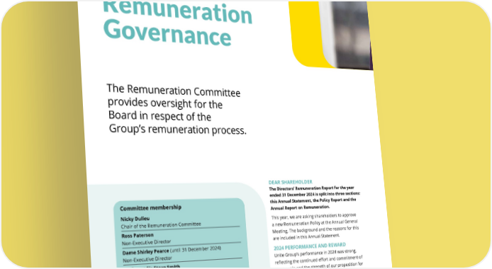 REMUNERATION COMMITTEE Remuneration Governance The Remuneration Committee provides oversight for the Board in respect of the Group’s remuneration process. GOVERNANCE Committee membership Nicky Dulieu Chair of the Remuneration Committee Ross Paterson Non-Executive Director Dame Shirley Pearce (until 31 December 2024) Non-Executive Director Professor Sir Steve Smith Non-Executive Director Ilaria del Beato (from 1 January 2025) Non-Executive Director DEAR SHAREHOLDER The Directors’ Remuneration Report for the year ended 31 December 2024 is split into three sections: this Annual Statement, the Policy Report and the Annual Report on Remuneration. This year, we are asking shareholders to approve a new Remuneration Policy at the Annual General Meeting. The background and the reasons for this are included in this Annual Statement. 2024 PERFORMANCE AND REWARD Unite Group’s performance in 2024 was strong, reflecting the continued effort and commitment of our people and the strength of our proposition for students and Higher Education providers alike. Our strategy continues to focus on being a Great Place to Live, Work and Invest, with progress made against each of these objectives during the year. Unite Group’s value-for-money offering, best-in- class operating platform and unrivalled student experience and support teams is evidenced by our strong occupancy performance and improvements THE UNITE GROUP PLC Annual Report and Accounts 2024 112