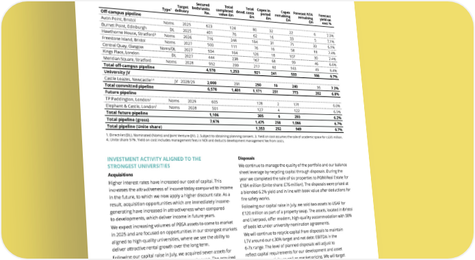 THE UNITE GROUP PLC Annual Report and Accounts 2024 32 STRATEGIC REPORT PERFORMANCE REVIEW Property review continued SECURED DEVELOPMENT AND PARTNERSHIPS PIPELINE Type1 Target delivery Secured beds/units No. Total completed value £m Total devel. costs £m Capex in period £m Capex remaining £m Forecast NTA remaining £m Forecast yield on cost % Off-campus pipeline Avon Point, Bristol Noms 2025 623 124 80 32 22 6 7.3% Burnet Point, Edinburgh DL 2025 401 76 62 16 33 5 7.1% Hawthorne House, Stratford³ Noms 2026 716 244 194 31 71 33 6.1% Freestone Island, Bristol Noms 2027 500 111 76 16 58 18 7.4% Central Quay, Glasgow Noms/DL 2027 934 164 126 18 107 30 7.4% Kings Place, London DL 2027 444 238 167 68 99 46 6.6% Meridian Square, Stratford Noms 2028 952 299 217 60 143 49 6.4% Total off-campus pipeline 4,570 1,253 921 241 533 186 6.7% University JV Castle Leazes, Newcastle2,4 JV 2028/29 2,000 291 250 10 240 16 7.3% Total committed pipeline 6,570 1,401 1,171 251 773 202 6.8% Future pipeline TP Paddington, London2 Noms 2029 605 178 2 171 6.0% Elephant & Castle, London2 Noms 2028 501 127 4 122 6.5% Total future pipeline 1,106 305 6 293 6.2% Total pipeline (gross) 7,676 1,475 258 1,066 6.7% Total pipeline (Unite share) 1,353 252 949 6.7% 1. Direct-let (DL), Nominated (Noms) and Joint Venture (JV). 2. Subject to obtaining planning consent. 3. Yield on cost assumes the sale of academic space for c.£45 million. 4. Unite share 51%. Yield on cost includes management fees in NOI and deducts development management fee from costs. INVESTMENT ACTIVITY ALIGNED TO THE STRONGEST UNIVERSITIES Acquisitions Higher interest rates have increased our cost of capital. This increases the attractiveness of income today compared to income in the future, to which we now apply a higher discount rate. As a result, acquisition opportunities which are immediately income- generating have increased in attractiveness when compared to developments, which deliver income in future years. We expect increasing volumes of PBSA assets to come to market in 2025 and are focused on opportunities in our strongest markets aligned to high-quality universities, where we see the ability to deliver attractive rental growth over the long term. Following our capital raise in July, we acquired seven assets for £244 million from USAF as part of a property swap. The acquired assets are located in strong markets (Bristol, Cardiff and Liverpool) and offer value-add opportunities through refurbishment as existing nominations expire over the next two to three years. During the year we also acquired the freehold interest of a 260- bed property in London for £37 million, which the Group had previously sold and leased back, from the freeholder. The property was acquired at below replacement cost, off affordable rents and we are planning a refurbishment upon expiry of a nomination agreement in 2026. Disposals We continue to manage the quality of the portfolio and our balance sheet leverage by recycling capital through disposals. During the year we completed the sale of six properties to PGIM Real Estate for £184 million (Unite share: £76 million). The disposals were priced at a blended 6.2% yield and in line with book value after deductions for fire safety works. Following our capital raise in July, we sold two assets to USAF for £120 million as part of a property swap. The assets, located in Bristol and Liverpool, offer modern, high-quality accommodation with 58% of beds let under university nomination agreements. We will continue to recycle capital from disposals to maintain LTV around our c.30% target and net debt: EBITDA in the 6-7x range. The level of planned disposals will adjust to reflect capital requirements for our development and asset management activity as well as market pricing. We will target future disposals of around £100-150 million p.a. (Unite share). Asset management We see significant opportunities to create value through asset management projects in our existing estate. Refurbishment ranges from smaller projects focused on upgrading communal areas and energy efficiency, through to full building refurbishment or more significant works such as extension or redevelopment. These projects have shorter lead times than new developments, often carried out over the summer period, and deliver both attractive risk-adjusted returns and significant enhancements to the student experience.