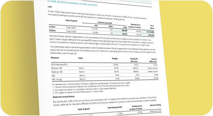 THE UNITE GROUP PLC Annual Report and Accounts 2024 131 RELATIVE IMPORTANCE OF SPEND ON PAY The table across shows shareholder distributions (i.e. dividends and share buybacks) and total employee pay expenditure for the financial years ended 31 December 2023 and 31 December 2024, along with the percentage change in both. Total employee pay expenditure excludes social security costs; distributions to shareholders reflects actual payments made during the relevant financial year. 2024 2023 % change Total employee pay expenditure £85.2m £75.7m 12.5% Distributions to shareholders £137.8m £117.3m 17.5% SCHEME INTERESTS AWARDED IN 2024 (AUDITED) LTIP In April 2024, Executive Directors were granted awards under the LTIP with a face value of 200% of their respective salaries. Any awards vesting for performance will be subject to an additional two-year holding period. Date of grant Interests granted Market price at date of award Face value PSP ESOS Total J Lister 9 April 2024 127,737 631 128,368 949.5p £1,218,854 M Burt 9 April 2024 82,840 631 83,471 949.5p £792,557 Vesting of these awards is dependent on the achievement of three-year performance targets as set out below. As noted in last year’s report, target setting for the adjusted EPS measure was delayed to give the Committee time to consider a range of relevant internal and external reference points, with these targets subsequently set out in a market announcement on 10 April 2024. The Committee retains overarching discretion under the Remuneration Policy to approve the final vesting of these awards, and any payout will be scrutinised by the Committee to ensure it reflects the underlying performance of the Company and the experience of stakeholders over the period. Measure Note Weight Threshold 25% max. Stretch 100% max. 2026 Adjusted EPS 28.0% 50.0p 53.0p Relative TSR Note 1 28.0% Median Upper quartile Relative TAR Note 1 28.0% Median Upper quartile OEI Note 2 8.0% 7.9% 15.8% EPC ratings Note 3 8.0% 98.6% 100.0% For all measures: no vesting below Threshold; straight-line vesting between Threshold and Stretch targets. 1. TSR and TAR are measured relative to the constituents of the FTSE 350 Real Estate Supersector Index. 2. OEI targets are based on a cumulative reduction: 2026 vs. 2023 baseline (kWh/m2). 3. EPC targets are based on the % of floorspace A-C rated in 2026. Deferred annual bonus During the year, 50% of the annual bonus earned by Joe Lister in respect of the 2023 financial year was satisfied in Unite Group shares, deferred for two years. Mike Burt’s 2023 annual bonus related to his previous role and accordingly no deferral applied. SAYE During 2024, no Executive Directors entered into a new savings contract under the SAYE plan. Details of all outstanding awards under this plan are included in the table on page 137. Date of grant Interests granted Market price at date of award Date of vesting J Lister 28 February 2024 17,499 950.0p 28 February 2026 PAYMENTS TO PAST DIRECTORS (AUDITED) As set out in last year’s report, Richard Smith stepped down from the Board on 31 December 2023 and remained as an advisor to the business until the 3 October 2024. All payments made to Richard in relation to the 2023 financial year were disclosed fully in last year’s Remuneration Report. Richard received base salary £440,169, pension £40,702 and other contractual benefits £12,447 through to 3 October 2024. Richard was treated as a Good Leaver in respect of outstanding PSP awards. Vesting of previously granted awards during the 2024 financial year were as follows: 66,173 shares (76.0% vesting) under the 2021 PSP which remain