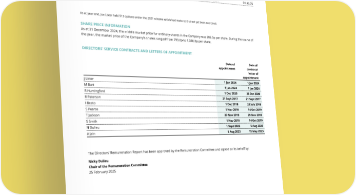 THE UNITE GROUP PLC Annual Report and Accounts 2024 137 SAYE Plan Held at 1 Jan 2024 Granted during the year Option price Exercised during the year Held at 31 Dec 2024 Maturity date Note 1 J Lister SAYE 913 - 985.2p - 913 01.12.24 SAYE 1,251 - 741.2p - 1,251 01.12.26 As at year-end, Joe Lister held 913 options under the 2021 scheme which had matured but not yet been exercised. SHARE PRICE INFORMATION As at 31 December 2024, the middle market price for ordinary shares in the Company was 806.5p per share. During the course of the year, the market price of the Company’s shares ranged from 793.0p to 1,046.0p per share. DIRECTORS’ SERVICE CONTRACTS AND LETTERS OF APPOINTMENT Date of appointment Date of contract/ letter of appointment J Lister 1 Jan 2024 1 Jan 2024 M Burt 1 Jan 2024 1 Jan 2024 R Huntingford 1 Dec 2020 26 Oct 2020 R Paterson 21 Sept 2017 21 Sept 2017 I Beato 1 Dec 2018 20 July 2018 S Pearce 1 Nov 2019 14 Oct 2019 T Jackson 29 Nov 2019 29 Nov 2019 S Smith 1 Nov 2019 14 Oct 2019 N Dulieu 1 Sept 2022 5 Aug 2022 A Jain 1 Aug 2023 15 May 2023 The Directors’ Remuneration Report has been approved by the Remuneration Committee and signed on its behalf by: Nicky Dulieu Chair of the Remuneration Committee 25 February 2025