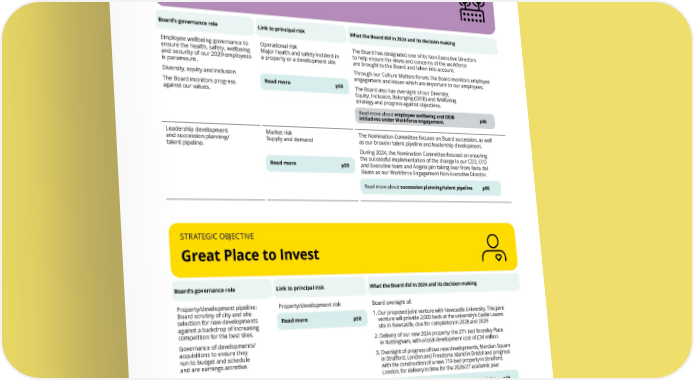 THE UNITE GROUP PLC Annual Report and Accounts 2024 95 STRATEGIC OBJECTIVE Great Place to Work Board’s governance role Link to principal risk What the Board did in 2024 and its decision-making Employee wellbeing governance to ensure the health, safety, wellbeing and security of our 2029 employees is paramount. Diversity, equity and inclusion The Board monitors progress against our values. Operational risk Major health and safety incident in a property or a development site Read more p58 The Board has designated one of its Non-Executive Directors to help ensure the views and concerns of the workforce are brought to the Board and taken into account. Through our Culture Matters forum, the Board monitors employee engagement and issues which are important to our employees. The Board also has oversight of our Diversity, Equity, Inclusion, Belonging (DEIB) and Wellbeing strategy and progress against objectives. Read more about employee wellbeing and DEIB initiatives under Workforce engagement p86 Leadership development and succession planning/ talent pipeline. Market risk Supply and demand Read more p59 The Nomination Committee focuses on Board succession, as well as our broader talent pipeline and leadership development. During 2024, the Nomination Committee focused on ensuring the successful implementation of the change in our CEO, CFO and Executive team and Angela Jain taking over from Ilaria del Beato as our Workforce Engagement Non-Executive Director. Read more about succession planning/talent pipeline p98 STRATEGIC OBJECTIVE Great Place to Invest Board’s governance role Link to principal risk What the Board did in 2024 and its decision-making Property/development pipeline: Board scrutiny of city and site selection for new developments against a backdrop of increasing competition for the best sites. Governance of developments/ acquisitions to ensure they run to budget and schedule and are earnings accretive. Property/development risk Read more p58 Board oversight of: 1. Our proposed joint venture with Newcastle University. This joint venture will provide 2,000 beds at the university’s Castle Leazes site in Newcastle, due for completion in 2028 and 2029 2. Delivery of our new 2024 property: the 271-bed Bromley Place in Nottingham, with a total development cost of £34 million 3. Oversight of progress of two new developments, Merdian Square in Stratford, London and Freestone Island in Bristol and progress with the construction of a new 719-bed property in Stratford, London, for delivery in time for the 2026/27 academic year. Read more in the Development and partnership activity p30 Disposals: Board governance of our portfolio recycling as we increase our exposure to the UK’s best universities, while generating capital to invest in further investment activity. Property/development risk Read more p58 Board oversight of the sale of six properties with sales proceeds of £184 million which will be reinvested into the improvement of our estate and to meet redemption requests in USAF. Read more in the Disposals p32 Dividend Policy: Board governance of our Dividend Policy. Financing risk Read more p61 Board focus on dividend payments with a payout ratio of 80% of adjusted EPS. The Board also considered and recommended the adoption of an enhanced scrip dividend for the 2023 final dividend.