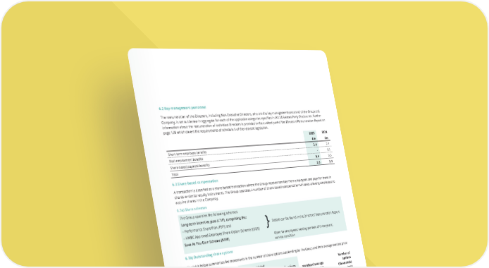 2024 £m 2.7 0.1 0.5 3.3 6.2 Key management personnel The remuneration of the Directors, including Non-Executive Directors, who are the key management personnel of the Group and Company, is set out below in aggregate for each of the applicable categories specified in IAS 24 Related Party Disclosures. Further information about the remuneration of individual Directors is provided in the audited part of the Directors’ Remuneration Report on page 128 which covers the requirements of schedule 5 of the relevant legislation. 2025 £m Short-term employee benefits 2.4 Post employment benefits - Share-based payment benefits 0.4 Total 2.8 6.3 Share-based compensation A transaction is classified as a share-based transaction where the Group receives services from employees and pays for these in shares or similar equity instruments. The Group operates a number of share-based compensation schemes allowing employees to acquire shares in the Company. 6.3a) Share schemes The Group operates the following schemes: Long-term incentive plan (LTIP), comprising the: – Performance Share Plan (PSP); and Details can be found in the Directors’ Remuneration Report – HMRC Approved Employee Share Option Scheme (ESOS) Save As You Earn Scheme (SAYE) Open to employees; vesting periods of three years; service condition 6.3b) Outstanding share options The table below summarises the movements in the number of share options outstanding for the Group and their average exercise price: Weighted average exercise price Number of options (thousands) 2025 2025 Outstanding at 1 January £2.53 2,381 Forfeited during the year £2.70 (1,020) Exercised during the year £2.61 (314) Granted during the year £2.33 1,072 Outstanding at 31 December £2.61 2,119 Exercisable at 31 December £10.80 80 For those options exercised in the year, the average share price during 2025 was £7.45 (2024: £9.35). For those options still outstanding, the range of exercise prices at the year-end was 0p to 1,121p (2024: 0p to 1,121p) and the weighted average remaining contractual life of these options was 4.4 years (2024: 3.9 years). The Group funds the purchase of its own shares by the Employee Share Ownership Trust to meet the obligations of the LTIP and Executive bonus scheme. The purchases are shown as Own shares acquired in retained earnings. As at 31 December 2025, the number of shares held by the ESOT was 190,675 (2024: 203,898). The accounting is in accordance with the relevant standards. No further information is given as the amounts for share-based payments are immaterial. Weighted average exercise price Number of options (thousands) 2024 2024 £2.49 1,942 £5.15 (170) £1.20 (201) £2.84 810 £2.53 2,381 £9.65 84 THE UNITE GROUP PLC Annual Report and Accounts 2025 195