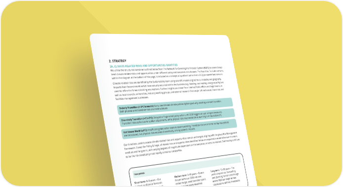 2. STRATEGY 2A. CLIMATE-RELATED RISKS AND OPPORTUNITIES IDENTIFIED We utilise the structured scenarios outlined below from The Network for Greening the Financial System (NGFS) to assess Group- level climate-related risks and opportunities under different policy and temperature outcomes. The Too Little, Too Late scenario, within the diagram at the bottom of this page, is included as a conceptual quadrant rather than a fully parameterised scenario. Climate - related risks are identified by the Sustainability team using scientific models aligned to our industry and geography. Impacts from hazard events which have actually occurred within the business (e.g. flooding, overheating, energy volatility) are used to refine the forward - looking assumptions. Further insights are drawn from internal Public Affairs and Legal teams, as well as local councils, universities, industry working groups, and external research from major UK real - estate, insurance, and facilities - management businesses. Orderly Transition (1.5°C Scenario): Early, coordinated climate policies tighten gradually, enabling a smooth transition. Both physical and transition risks are more subdued. Disorderly Transition (≈1.5–2°C): Delayed or fragmented policy action until 2030 triggers abrupt, stringent measures. Transition risks spike due to sudden adjustments, while physical risks stay moderate as warming is limited below 2°C. Hot House World (≥4°C): Insufficient global action leads to severe warming. Transition risks are minimal as few new policies are introduced, but physical risks escalate dramatically, driving systemic impacts. Our timelines used to assess climate-related risks and opportunities remain unchanged, aligning with the group Risk Management framework. Except for Policy & Legal, all stated risks and opportunities identified below are expected to materialise over the short, medium and long-term, with varying degrees of magnitude dependant on the temperature scenario realised. Overheating continues to be the risk developing most rapidly across our properties. Scale of climate risks and opportunities overlaid into NGFS scenario model Short term: 0–3 years – Our highest confidence forecasts including the detailed annual budget and subsequent two years where we have significant visibility in our Business Plan. Medium term: 3–10 years – Covers the period to our 2030 net zero carbon target, asset transition plans and other regulatory deadlines such as EPC B in 2030 and the useful life of building fit out. Long term: 10–30 years – The period beyond our forecasting and planning horizon and the age where PBSA can begin to face obsolescence without investment. Time periods ~£15m (per annum) ~£3.3m – £37.8m: 2025-2050 Flooding Heat stress Reduced heating costs (opportunity) Market risk, commodity & resource efficiency Reputation M L ~£10m (per annum, OPEX) Transition risks Physical risks £10–12m (per annum, CAPEX) Technology Policy & Legal ≈1.5-2°C 1.5°C ≥4°C ‘Too Little, Too Late’ ~£0.8m – £1.7m (pa) Note: Detailed overviews on methodo- logical assumptions can be found within each corresponding risk/opportunity statement. Where financial impact is yet to be modelled, we have indicated 'L' 'M' or 'H' for Low, Medium, or High. Further statistical analysis due in 2026. Bubble size denotes rough scale of estimated impact. THE UNITE GROUP PLC Annual Report and Accounts 2025 65