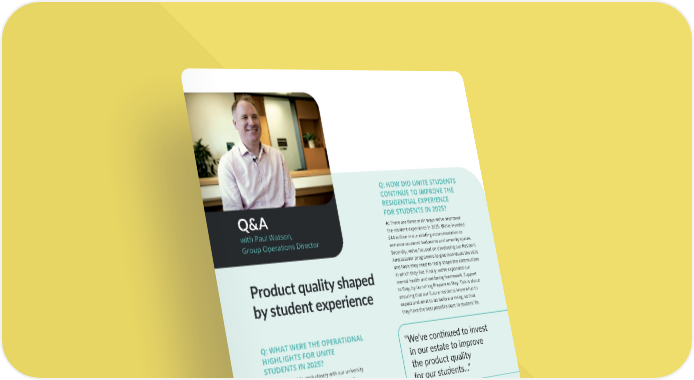 Q: WHAT WERE THE OPERATIONAL HIGHLIGHTS FOR UNITE STUDENTS IN 2025? A: We continued to work closely with our university partners and delivered new technology to our operations and central support team, to build a clearer picture of the resident experience and better predict students' needs, while also enhancing our maintenance performance. We've added functionality to our student app, which allows residents to connect with each other and log requests with us. It was fantastic to see the app ranked as the number one PBSA app in 2025. Q: WHAT OPERATIONAL CHANGES DID YOU IMPLEMENT IN 2025 AND WHAT ARE YOU MOST PROUD OF? A: We’ve continued to invest in our estate to improve the product quality for our students and to deliver ongoing fire and security enhancements, as part of our building safety commitments. We've further enhanced our digital platforms to give students access to better information and resources, which allows us to focus more on community mental health and wellbeing support. In the summer, we introduced simpler recycling, a game-changing sustainability initiative that will reduce our general waste and increase our recycling. Q: HOW DID UNITE STUDENTS CONTINUE TO IMPROVE THE RESIDENTIAL EXPERIENCE FOR STUDENTS IN 2025? A: There are three main ways we’ve improved the resident experience in 2025. We’ve invested £44 million in our existing accommodation to enhance students’ bedrooms and amenity spaces. Secondly, we’ve focused on developing our Resident Ambassador programme to give individuals the skills and tools they need to really shape the communities in which they live. Finally, we’ve expanded our mental health and wellbeing framework, Support to Stay, by launching Prepare to Stay. This is about ensuring that our future residents know what to expect and what to do before arriving, so that they have the best possible start to student life. Q: WHAT HAS THE FEEDBACK BEEN FROM STUDENTS OVER THE PAST YEAR? A: The feedback this year has been really positive. Our outgoing cohort helped us to secure our first ever Gold Award in the Spring Global Student Living Index survey, which we retained in the Autumn survey. We also surveyed university applicants about what they’re expecting from their university experience to inform our check-in experience, and the support we provide to students in their first six weeks. 86% of students were satisfied with their overall, check-in experience. The comments from our newest residents have been overwhelmingly positive (96%) reflecting the warm, friendly welcome they receive from colleagues on arrival and the positive first impression from seeing a clean, well-maintained property. Product quality shaped by student experience “ We’ve continued to invest in our estate to improve the product quality for our students...” Q&A with Paul Watson, Group Operations Director THE UNITE GROUP PLC Annual Report and Accounts 2025 27