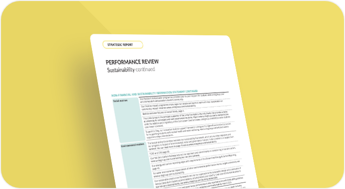 PERFORMANCE REVIEW Sustainability continued Male Male % Female Female % Total Board 6 60% 4 40% 10 Management 43 65.2% 23 34.8% 66 All other employees 1,030 53.3% 901 46.7% 1,931* Total 1,073 53.7% 924 46.3% 1,997 GENDER SPLIT SUSTAINABILITY REPORTING Our Sustainability Report includes detailed data in line with the European Public Real Estate Association Sustainability Best Practice Reporting Guidelines (EPRA sBPR) and in 2025 we retained a Silver EPRA sBPR award for FY24 reporting. Climate- related risks are disclosed in line with TCFD and CFD on page 63. We also disclose to CDP, earning an A rating in 2025, see www.cdp.net/en/data/scores, and to the Global Real Estate Social matters Our Resident Ambassador programme provides peer-to-peer support for students www.unitegroup.com/ articles/resident-ambassadors-student-community. Our Positive Impact programme encourages our people and teams to work with local stakeholders on community impact initiatives www.unitegroup.com/sustainability. Market overview focuses on social trends, page 4. The Unite Group is the principal supporter of the Unite Foundation, the only charity that provides a home at university for estranged and care-experienced students, https://www.unitegroup.com/sustainability/the- unite-foundation and a signatory of the Care Leaver Covenant www.unitegroup.com/articles/unite-students- care-leaver-covenant. Support to Stay, our innovative student support framework is designed to align with universities’ processes for supporting students with mental health and wider wellbeing, www.unitegroup.com/articles/student- support-to-stay-unite-students. NON-FINANCIAL AND SUSTAINABILITY INFORMATION STATEMENT CONTINUED Environmental matters The Sustainability Committee oversees our sustainability framework, which sets out clear objectives and our progress in respect of environmental, social and governance matters. It also considers our supply chain network. You can read more on page 45 and at www.unitegroup.com/sustainability. TCFD and CFD page 63. Our Net Zero Carbon Pathway sets out our approach and commitments to transitioning to net zero carbon, www.unitegroup.com/sustainability/our-net-zero-pathway. Our energy and carbon reporting aligns with requirements of the Streamlined Energy & Carbon Reporting, page 49. For wider environmental impact details of other environmental performance metrics, targets and activity, see www.unitegroup.com/sustainability. Our sustainable construction framework sets out our approach to the sustainable design and construction of new purpose-built student accommodation, refurbishments and retrofits. It will also inform how we procure new net-zero developments, see www.unitegroup.com/building-sustainably. EPRA and sBPR Further environmental, social and governance performance is also reported in line with EPRA sBPR guidelines in our separate Sustainability Report https://www.unitegroup.com/sustainability-report-2025 . Health and Safety The Health & Safety Committee monitor our Health & Safety performance and oversee our Health & Safety strategy to help keep people safe and secure across our operational buildings and development sites, page 110. Sustainability Benchmark (GRESB), retaining our 4-star GRESB rating for standing-assets and achieved a 5-star rating for new development. Our GRESB scorecard is available at www. unitegroup.com/sustainability/policies-documentation-2. We are outside of scope of EU CSRD reporting and expect to report in line with the proposed UK Sustainability Reporting Standard S1 and S2 in due course as required. THE UNITE GROUP PLC Annual Report and Accounts 2025 48 STRATEGIC REPORT