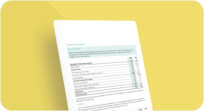 4.3 Net financing costs/(gains) Accounting policies Net financing costs comprise interest payable on borrowings and interest on lease liabilities, less interest receivable on funds invested (both calculated using the effective interest rate method) and gains and losses on hedging instruments that are recognised in the income statement. 2025 Recognised in the income statement £m Interest income (6.1) Finance income (6.1) Gross interest expense on loans 42.1 Amortisation of fair value of debt recognised on acquisition (2.3) Interest capitalised (26.8) Loan interest and similar charges 13.0 Interest on lease liabilities 7.6 Mark to market changes in interest rate swaps 22.5 Swap cancellation and loan break costs 0.0 Finance costs 43.1 Net financing costs 37.0 The average cost of the Group’s wholly-owned debt at 31 December 2025 is 3.3% (2024: 3.0%). The overall average cost of debt on an EPRA basis is 3.9% (2024: 3.6%). 4.4 Gearing LTV is a key indicator that the Group uses to manage its indebtedness. The Group also monitors gearing, which is calculated using EPRA net tangible assets (NTA) and adjusted net debt. Adjusted net debt excludes IFRS 16 lease liabilities, the unamortised fair value of debt recognised on acquisition and mark to market of interest rate swaps as shown below. The Group’s gearing ratios are calculated as follows: 2025 Note £m Cash and cash equivalents 5.1 35.8 Current borrowings 4.1 - Non-current borrowings 4.1 (1,256.2) Lease liabilities 4.6a (74.3) Interest rate swaps 4.2 44.0 Net debt per balance sheet (1,250.7) Lease liabilities (add back) 4.6a 74.3 Unamortised fair value of debt recognised on acquisition 2.3c 7.9 Adjusted net debt (1,168.5) Reported net asset value 4,733.8 EPRA NTA 2.3c 4,684.9 Gearing Gearing (Basic: net debt / reported net asset value) 26% Adjusted gearing (adjusted net debt / EPRA NTA) 25% Loan to value 2.3a 27% THE UNITE GROUP PLC Annual Report and Accounts 2025 183 2024 £m (16.7) (16.7) 39.0 (4.1) (15.5) 19.4 8.8 0.4 3.1 31.7 15.0 2024 £m 274.3 - (1,273.8) (72.8) 53.4 (1,018.9) 72.8 11.1 (935.0) 4,811.5 4,758.4 21% 20% 24%
