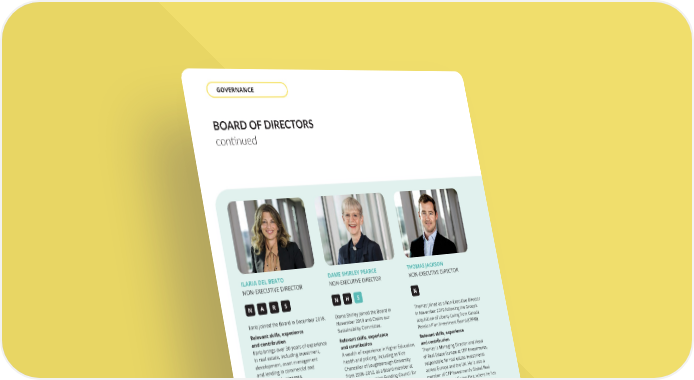 BOARD OF DIRECTORS continued Ilaria joined the Board in December 2018. Relevant skills, experience and contribution Ilaria brings over 30 years of experience in real estate, including investment, development, asset management and lending in commercial and operational businesses. Ilaria was previously CEO of Frasers Property UK, and a member of the executive leadership team of Frasers Property, the Singapore listed global real estate group. She was also formerly CEO of GE Capital UK, a regulated Bank and corporate lender and led GE Capital Real Estate UK, a commercial real estate investor, developer and lender. External appointments • Frasers Property UK (Advisor) Dame Shirley joined the Board in November 2019 and Chairs our Sustainability Committee. Relevant skills, experience and contribution A wealth of experience in Higher Education, health and policing, including as Vice Chancellor of Loughborough University from 2006–2012, as a Board member at the Higher Education Funding Council for England, the Universities and Colleges Employers Association, and the Healthcare Commission. Non-Executive Director roles at Health Education England and the Norfolk, Suffolk and Cambridgeshire Strategic Health Authority. She was appointed CBE in 2005 for services to education in the NHS and in 2014 appointed DBE for services to Higher Education. Dame Shirley brings her wide-ranging and hands-on experience in the Higher Education sector to the Board, which is especially critical at a time of ongoing change in the sector. External appointments • Higher Education Quality Assurance Panel for the Ministry of Education in Singapore • Royal Anniversary Trust (Trustee) • HCA (Advisory Board member) • London Academy of Music and Dramatic Art (Trustee) Thomas joined as a Non-Executive Director in November 2019 following the Group’s acquisition of Liberty Living from Canada Pension Plan Investment Board (CPPIB). Relevant skills, experience and contribution Thomas is Managing Director and Head of Real Estate Europe at CPP Investments, responsible for real estate investments across Europe and the UK. He is also a member of CPP Investment’s Global Real Estate Investment Committee, where he has been instrumental in building the European, UK and Indian real estate portfolio. Thomas was previously a Vice President in the real estate investment banking team at Macquarie bank and focused on M&A transactions within the UK and European public and private real estate companies. His international experience is invaluable for the Board, providing a wider perspective on real estate. External appointments • CPP Investments (Managing Director, Head of Real Estate Europe) ILARIA DEL BEATO NON-EXECUTIVE DIRECTOR DAME SHIRLEY PEARCE NON-EXECUTIVE DIRECTOR THOMAS JACKSON NON-EXECUTIVE DIRECTOR N A R N N S H S THE UNITE GROUP PLC Annual Report and Accounts 2025 78 GOVERNANCE