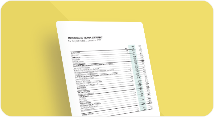 2025 Note £m Rental income 2.4 307.7 Other income 2.4 25.1 Total revenue 332.8 Costs of sales (96.8) Operating expenses (57.9) Expected credit losses (2.6) Results from operating activities before (losses)/gains on property 175.5 Loss on disposal of property (1.3) Write-off of inventories and other fixed assets (12.0) Net valuation (losses)/gains on property (owned and under development) 3.1 (72.3) Net valuation losses on property (leased) 3.1 (12.9) Profit before net financing (costs)/gains and share of joint venture profit 77.0 Loan interest and similar charges 4.3 (13.0) Interest on lease liability 4.3 (7.6) Mark to market changes in interest rate swaps 4.3 (22.5) Swap cancellation and loan break costs 4.3 - Finance costs (43.1) Finance income 4.3 6.1 Net financing costs (37.0) Share of joint venture profit 3.3b 57.7 Profit before tax 97.7 Current tax 2.5a (3.1) Deferred tax 2.5a 3.0 Profit for the year 97.6 Profit for the year attributable to Owners of the Parent Company 97.6 Non-controlling interest - 97.6 Earnings per share Basic 2.2c 19.9 Diluted 2.2c 19.9 All results are derived from continuing activities. CONSOLIDATED STATEMENT OF COMPREHENSIVE INCOME For the year ended 31 December 2025 Note 2025 £m Profit for the year 97.6 Share of joint venture movements in effective hedges 3.3b (0.5) Other comprehensive income for the year (0.5) Total comprehensive income for the year 97.1 Attributable to Owners of the Parent Company 97.1 Non-controlling interest - 97.1 All other comprehensive income may be classified as profit and loss in the future. There are no tax effects on items of other comprehensive income. CONSOLIDATED INCOME STATEMENT For the year ended 31 December 2025 2024 £m 282.0 17.3 299.3 (86.4) (43.9) (0.9) 168.1 (9.8) - 186.7 (1.9) 343.1 (19.4) (8.8) (0.4) (3.1) (31.7) 16.7 (15.0) 115.9 444.0 (4.8) 2.6 441.8 441.9 (0.1) 441.8 96.3 96.1 2024 £m 441.8 (2.3) (2.3) 439.5 439.6 (0.1) 439.5 THE UNITE GROUP PLC Annual Report and Accounts 2025 147