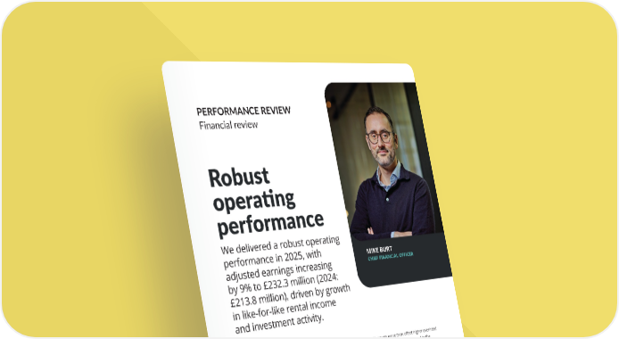 PERFORMANCE REVIEW Financial review NOI growth more than offset higher overhead and finance costs when compared to the prior year. Adjusted EPS grew 2% to 47.5p (2024: 46.6p), reflecting the growth in adjusted earnings and increased share count following our July 2024 equity raise. IFRS profit attributable to owners of the parent company reduced to £97.6 million in the year (2024: £441.9 million), reflecting the increase in adjusted earnings of £18.5 million, a revaluation loss of £73.7 million (2024: £239.6 million gain) and a £22.5 million loss for the valudation of interest rate swaps and cancellation costs (2024: £3.5 million loss). Note: The Group uses alternative performance measures (APMs) which are not defined or specified under IFRS. These APMs, which are not considered to be a substitute for IFRS measures, provide additional helpful information and include, among others, measures based on the European Public Real Estate Association (EPRA) best practice recommendations.The metrics are used internally to measure and manage the business. We delivered a robust operating performance in 2025, with adjusted earnings increasing by 9% to £232.3 million (2024: £213.8 million), driven by growth in like-for-like rental income and investment activity. MIKE BURT CHIEF FINANCIAL OFFICER Adjusted EPS 47.5p (2024: 46.6p) Total Accounting Return 2.1% (2024: 9.6%) Loan-to-value ratio 27% (2024: 24%) Robust operating performance THE UNITE GROUP PLC Annual Report and Accounts 2025 35