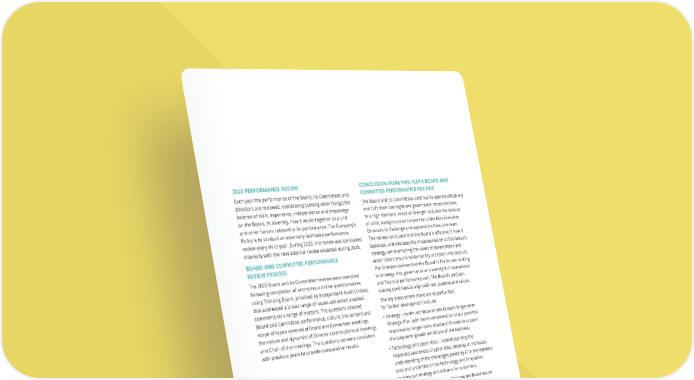 2025 PERFORMANCE REVIEW Each year the performance of the Board, its Committees and Directors are reviewed, considering (among other things) the balance of skills, experience, independence and knowledge on the Board, its diversity, how it works together as a unit and other factors relevant to its performance. The Company’s Policy is to conduct an externally facilitated performance review every third year. During 2025, the review was conducted internally with the next external review expected during 2026. BOARD AND COMMITTEE PERFORMANCE REVIEW PROCESS The 2025 Board and its Committee reviews were compiled following completion of anonymous online questionnaires using Thinking Board, provided by Independent Audit Limited, that addressed a broad range of issues and which enabled comments on a range of matters. The questions covered Board and Committee performance, culture, the content and scope of topics covered at Board and Committee meetings, the nature and dynamics of Director contributions at meetings and Chair of the meetings. The questions set were consistent with previous years to provide comparative results. CONCLUSION FROM THIS YEAR’S BOARD AND COMMITTEE PERFORMANCE REVIEWS The Board and its Committees continue to operate effectively and fulfil their oversight and governance responsibilities to a high standard. Areas of strength included the balance of skills, background and expertise of the Non-Executive Directors to challenge and support the Executive team. The review concluded that the Board is effective in how it develops, and oversees the implementation of the Group’s strategy, while ensuring the views of stakeholders and wider issues around sustainability are taken into account. The Directors believe that the Board fulfils its role relating to strategy, risk, governance and oversight of operational and financial performance well. The Board’s decision- making continues to align with our purpose and values. The key areas where there are opportunities for further development include: • Strategy – continued focus on the Group’s longer-term Strategic Plan, with more consideration of our potential responses to longer-term structural threats to support the long-term growth ambitions of the business. • Technology and cyber risks – notwithstanding the improved awareness of cyber risks, develop an increased understanding of the challenges posed by IT in this dynamic area and understand how technology and innovation enables our strategy and delivers for customers. • Crisis preparation – understanding how the Board would respond in a crisis, in particular a serious IT problem. 2024 Board performance recommendations and progress PROGRESS AGAINST THE 2024 BOARD PERFORMANCE RECOMMENDATIONS 1. Impact of technology and cyber risks –Technology and strategy have been a Board focus in 2025 and this will continue in 2026 given the dynamic nature of this topic. IT security, in particular cyber risks, were reviewed by both Board and Audit & Risk Committee during 2025 and this will continue into 2026. 2. Monitoring performance and overseeing culture – the Board continued its oversight of our operational policies and procedures to ensure they are consistently implemented across the business. Good progress has been made with our People Strategy, Culture Audit and enhanced People performance management, which were regularly discussed in Board and Committee meetings during the year. 3. Succession planning – The Board and Nomination Committee continue to oversee succession plans with dedicated sessions throughout the year. Folloiwng a search led by the Nominations Committee, Duncan Cooper will join the Board as a Non-Executive Director on 1 June 2026 and takeover as Chair of the Audit & Risk Committee when Ross Paterson steps down from the Board on 31 August 2026 at the end of his tenure. THE UNITE GROUP PLC Annual Report and Accounts 2025 99
