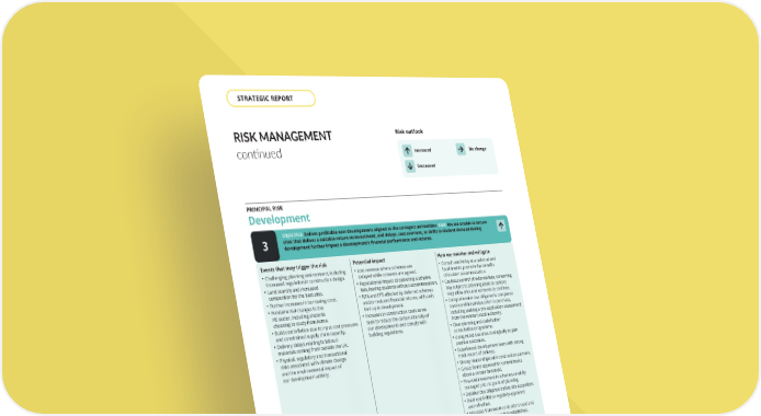 RISK MANAGEMENT continued Events that may trigger the risk • Challenging planning environment, including increased regulation in construction design. • Land scarcity and increased competition for the best sites. • Further increases in borrowing costs. • Fundamental changes to the HE sector, including students choosing to study from home. • Build cost inflation due to input cost pressures and constrained supply chain capacity. • Delivery delays relating to labour/ materials coming from outside the UK. • Physical, regulatory and transactional risks associated with climate change and the environmental impact of our development activity. Potential impact • Lost revenue where schemes are delayed while consents are agreed. • Reputational impact of delivering a scheme late, leaving students without accommodation. • NTA and EPS affected by deferred schemes and/or reduced financial returns, with cash tied up in development. • Increases in construction costs as we seek to reduce the carbon intensity of our developments and comply with building regulations. How we monitor and mitigate • Consult and lobby at a national and local level to promote the benefits of student accommodation. • Cautious control of external fees, converting any subject to planning deals to options may allow sites and consents to continue. • Comprehensive due diligence is completed on unconditional sites prior to purchase, including seeking a pre-application assessment from the relevant local authority. • Clear planning and stakeholder consultation programme. • Using mixed use sites strategically to gain positive outcomes. • Experienced development team with strong track record of delivery. • Strong relationships with construction partners. • Group Board approval for commitments above a certain threshold. • Financial investment in schemes carefully managed prior to grant of planning. • Detailed due diligence before site acquisition. • Build cost inflation regularly appraised and refreshed. • Mid-sized framework contractors used and longer-term relationships established. • Engagement with our supply chain regarding future reductions in embodied carbon through our development activity programme and project level governance, reporting and oversight. • Focus on delivering joint ventures with universities to develop on campus. OBJECTIVE: Deliver profitable new developments aligned to the strongest universities. RISK: We are unable to secure sites that deliver a suitable return on investment, and delays, cost overruns, or shifts in student demand during development further impact a development’s financial performance and returns. PRINCIPAL RISK Development 3 Events that may trigger the risk • Lack of investment in the quality of our product offering. • Increases in commuter students with more students living at home. • Increased regulation over rents. • Rapid changes in the macroeconomic environment driven by geopolitical factors. Potential impact • NTA and EPS affected by reduced financial returns. • Failure to deliver planned disposals may result in a deteriorating net debt position and negatively impact our ability to commit to future investments. How we monitor and mitigate • Five-year capital investment plan. • Disposal strategy to ensure we recycle capital effectively. • Disciplined investment approach to markets with demand/supply imbalance. • Long-term partnership arrangements with universities. • Geographically diverse portfolio. OBJECTIVE: Invest in or divest assets within our portfolio to ensure suitable returns and recycle capital. RISK: Ineffective allocation or recycling of capital within the portfolio may limit returns and growth potential. PRINCIPAL RISK Property portfolio 4 Increased Decreased Risk outlook No change See page 53 for information on risk appetite. THE UNITE GROUP PLC Annual Report and Accounts 2025 58 STRATEGIC REPORT