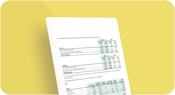 The carrying value and fair value of the Group’s and Company’s borrowings is analysed below: 2025 Carring value Fair value Group £m £m Level 1 IFRS fair value hierarchy 975.0 969.5 Other loans and unamortised arrangement fees 273.2 269.9 Total borrowings 1,248.2 1,239.4 2025 Carring value Fair value Company £m £m Level 1 IFRS fair value hierarchy 975.0 969.5 Other loans and unamortised arrangement fees 273.2 269.9 Total borrowings 1,248.2 1,239.4 The fair value of loans classified as Level 1 in the IFRS fair value hierarchy is determined using quoted prices in active markets for identical liabilities. The following table shows the changes in liabilities arising from financing activities: 2025 Group At 1 January Financing cash flows Interest expense Fair value adjustments Other changes At 31 December Borrowings 1,273.8 (15.0) - (1.1) (1.5) 1,256.2 Lease liabilities 72.8 (12.9) 7.6 - 6.8 74.3 Interest rate swaps (53.4) (13.0) - 22.5 (0.1) (44.0) Total liabilities from financing activities 1,293.2 (40.9) 7.6 21.4 5.2 1,286.5 Company Borrowings 1,263.7 (15.0) - 0.2 (0.7) 1,248.2 Interest rate swaps (53.4) (13.0) - 22.5 (0.1) (44.0) Total liabilities from financing activities 1,210.3 (28.0) - 22.7 (0.8) 1,204.2 2024 2024 Carrying value Fair value £m £m 975.0 956.6 288.7 275.4 1,263.7 1,232.0 2024 Carrying value Fair value £m £m 975.0 956.6 288.7 275.4 1,263.7 1,232.0 Group At 1 January Financing cash flows Interest expense Fair value adjustments Other changes At 31 December Borrowings 1,081.6 193.2 - (4.1) 3.1 1,273.8 Lease liabilities 83.8 (19.8) 8.8 - - 72.8 Interest rate swaps (56.0) - - 0.4 2.2 (53.4) Total liabilities from financing activities 1,109.4 173.4 8.8 (3.7) 5.3 1,293.2 Company Borrowings 468.6 800.0 - 0.2 (5.1) 1,263.7 Interest rate swaps (56.0) - - 0.4 2.2 (53.4) Total liabilities from financing activities 412.5 800.0 - 0.6 (2.9) 1,210.3 THE UNITE GROUP PLC Annual Report and Accounts 2025 181
