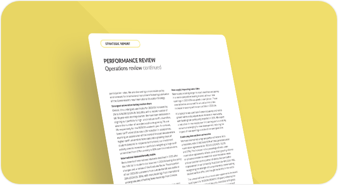 PERFORMANCE REVIEW Operations review continued participation rates. We are also seeing a more stable policy environment for international recruitment following publication of the Government’s new International Education Strategy. Strongest universities taking market share Overall, the undergraduate intake for 2025/26 increased by 2% to 578,000 (2024/25: 565,000), with a record number of UK 18-year-olds starting courses. We have been deliberate in aligning our portfolio to high- and medium-tariff universities, where the number of accepted applicants grew by 7% and 2% respectively for the 2025/26 academic year. In contrast, lower-tariff universities saw a 2% reduction in acceptances, marking an acceleration of the trend of the past decade where higher-tariff universities have captured a growing share of student demand. In response to this trend, our investment activity aims to increase our portfolio's weighting to high-tariff universities from 67% currently to 80% over the medium-term. International demand broadly stable Recruitment of international students stabilised in 2025 after the 14% fall in student visa issuance in 2024 following visa policy changes and a review of the Graduate Route. The proportion of our 2025/26 customers from outside the UK was stable at 28% (2024/25: 28%), with more bookings from international undergraduates offsetting fewer bookings from Chinese postgraduates. Recent data indicates broadly stable international student numbers, with 5% growth in international applicants through UCAS for the 2026/27 academic year balanced by fewer study visa applications in recent months. Students seeking value from university Students are increasingly selective when choosing where to study, with a growing focus on graduate outcomes and earnings potential as they seek to ensure they achieve value for money from their time at university. This is supported by data showing that the average Russell Group student enjoys a c.£350,000 lifetime earnings premium over a non-graduate, with the premium reducing materially for lower-ranked courses. The highest-quality universities continue to see healthy accommodation demand as the enduring appeal of the UK’s top universities attracts students from around the world. At lower-tariff providers, an increasing proportion of students are choosing to live at home as an alternative to the traditional residential experience. At these universities, around half of students now choose to live at home to reduce the overall cost of university, compared to only 15% at high-tarrif providers. New supply impacting some cities New supply is taking longer to reach stabilised occupancy in a more competitive leasing market, with our new openings in 2025 65% occupied on completion. These new deliveries accounted for around a third of the increase in vacancy within our portfolio in 2025/26. It is typical to see a period of lower occupancy and rental growth while a city adjusts to an increase in new supply, with Nottingham particularly impacted in 2025. We expect a reduction in new supply over the coming years as viability remains challenging for new development, reducing the impact of new openings outside of the strongest cities. Continuing demand from universities We have maintained a high proportion of income let to universities, with 37,660 beds (59% of total) provided under nomination agreements for 2025/26 (2024/25: 38,326 and 57%). The increase in the percentage of beds under nomination agreements reflects universities’ growing reliance on private providers to meet their accommodation needs and our position as the partner of choice. We saw further improvement in our University Trust Score to +81 (2024: +80), recognising the strength of our partnerships, sector-leading student welfare offer, and thought leadership in the sector. The unexpired term of our nomination agreements increased to 6.1 years for 2025/26 (2024/25: 5.8 years) reflecting the strength of our relationships and universities’ willingness to commit to high-quality accommodation. A balance of nomination agreements and direct-let beds provides the benefit of having income secured by universities, as well as the ability to offer rooms to re-bookers and postgraduates and determine market pricing on an annual basis. We are targeting an increase in beds under nomination agreements to 60% going forward, aided by our university joint ventures and new developments as well as planned disposals. 83% of our nomination agreements, by income, are multi-year and therefore benefit from annual fixed or inflation-linked uplifts based on RPI or CPI (2024/25: 67%). The remaining agreements are single year, and we achieved a renewal rate of 77% with universities for 2025/26 where we sought to renew (2024/25: 81%). THE UNITE GROUP PLC Annual Report and Accounts 2025 24 STRATEGIC REPORT