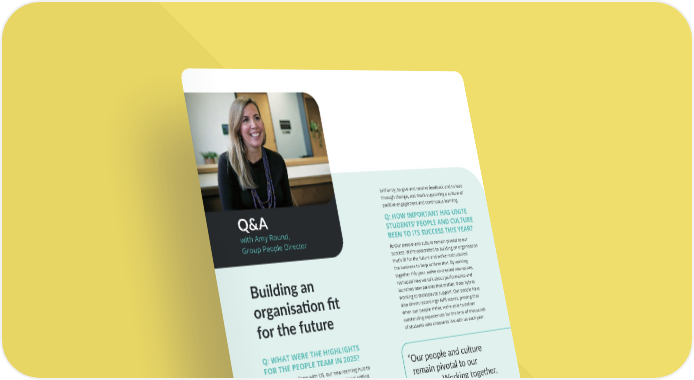 Q: WHAT WERE THE HIGHLIGHTS FOR THE PEOPLE TEAM IN 2025? A: We launched Grow with US, our new learning hub to bring together performance, learning and goal setting into one easy-to-use place. We also began embedding our values into everything we do, from performance conversations to the Big Welcome, which is our new Company induction. We’ve also seen strong engagement with My Impact, a new performance-enabled framework which we launched last year. Around 80% of our community is engaging with conversations around what they're delivering and how they're delivering. Finally, we opened a new London office this year, which is sparking collaboration, connection and high performance. Q: WHAT CHANGES HAS UNITE STUDENTS MADE TO LEARNING AND DEVELOPMENT IN 2025? A: This year we've made a number of changes to our learning and development offering, not just through structured development programmes but through real conversations about growth and career opportunities. We've put a big focus this year on our managers, because 70% of the experience that we have at work relates to our managers. We’ve really focused on building up their confidence to lead brilliantly, to give and receive feedback and to lead through change, and that’s supporting a culture of positive engagement and continuous learning. Q: HOW IMPORTANT HAS UNITE STUDENTS’ PEOPLE AND CULTURE BEEN TO ITS SUCCESS THIS YEAR? A: Our people and culture remain pivotal to our success. We’re committed to building an organisation that’s fit for the future and we’ve restructured the business to help achieve that. By working together this year, we’ve co-created new values, reshaped how we talk about performance and launched new policies that matter, from hybrid working to menopause support. Our people have also driven record high NPS scores, proving that when our people thrive, we're able to deliver outstanding experiences for the tens of thousands of students who choose to live with us each year. Q: WHAT ARE THE KEY PRIORITIES FOR THE PEOPLE TEAM IN 2026? A: Evolving our technology platforms and ways of working to ensure that work is easy and fun for our people. We'll be launching a new wellbeing network, we'll continue to support our managers on their journey, and we'll expand career opportunities for our people. We’re also excited to to have moved to a new Bristol office, which we hope will further enhance our ability to connect with each other, to collaborate and get stuff done. Building an organisation fit for the future “ Our people and culture remain pivotal to our success. Working together, we've co-created new values and reshaped how we talk about performance.” Q&A with Amy Round, Group People Director THE UNITE GROUP PLC Annual Report and Accounts 2025 39