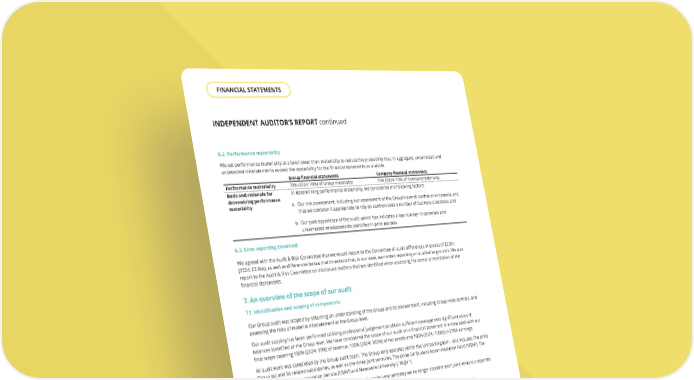 INDEPENDENT AUDITOR’S REPORT continued 6.2. Performance materiality We set performance materiality at a level lower than materiality to reduce the probability that, in aggregate, uncorrected and undetected misstatements exceed the materiality for the financial statements as a whole. Group financial statements Company financial statements Performance materiality 70% (2024: 70%) of Group materiality 70% (2024: 70%) of Company materiality Basis and rationale for determining performance materiality In determining performance materiality, we considered the following factors: a. Our risk assessment, including our assessment of the Group’s overall control environment, and that we consider it appropriate to rely on controls over a number of business processes; and b. Our past experience of the audit, which has indicated a low number of corrected and uncorrected misstatements identified in prior periods. 6.3. Error reporting threshold We agreed with the Audit & Risk Committee that we would report to the Committee all audit differences in excess of £2.9m (2024: £2.9m), as well as differences below that threshold that, in our view, warranted reporting on qualitative grounds. We also report to the Audit & Risk Committee on disclosure matters that we identified when assessing the overall presentation of the financial statements. 7. An overview of the scope of our audit 7.1. Identification and scoping of components Our Group audit was scoped by obtaining an understanding of the Group and its environment, including Group-wide controls, and assessing the risks of material misstatement at the Group level. Our audit scoping has been performed utilising professional judgement to obtain sufficient coverage over significant account balances identified at the Group level. We have considered the scope of our audit on a financial statement line-item basis with our final scope covering 100% (2024: 99%) of revenue, 100% (2024: 100%) of net assets and 100% (2024: 100%) of EPRA earnings. All audit work was completed by the Group audit team. The Group only operates within the United Kingdom – this includes The Unite Group plc and its related subsidiaries, as well as the three joint ventures, The Unite UK Student Accommodation Fund (‘USAF’), The London Student Accommodation Vehicle (‘LSAV’) and Newcastle University (`NUJV`). There has been a change in our scoping approach since the prior year whereby we no longer consider each joint venture a separate component. The Group was audited as a single component. We have also tested the consolidation process to confirm our conclusion that there were no significant risks of material misstatement of the aggregated financial information. 7.2. Our consideration of the control environment We obtained an understanding of the IT environment as part of our risk assessment procedures, including the newly implemented systems in the year (Oracle Fusion and Financial Consolidation and Close System (FCCS) (consolidation tool)). We involved IT specialists to assess the relevant controls over the systems in the scope of our audit. We identified and assessed risks arising from each IT system and the supporting infrastructure technologies based on the role of application in the Group’s flow of transactions and where considered relevant, we obtained an understanding of relevant controls. Where required, in support of our audit approach, we tested the relevant controls. In response to access control deficiencies identified within Oracle Fusion we sought to test mitigating manual controls as an alternative. Where mitigating controls were not identified we revisited our risk assessment and altered the nature, timing and extent of our procedures. From our understanding of the Group and after assessing relevant controls, we tested and relied on controls in performing our audit of rental income. We had planned to test and rely on relevant controls relating to the investment property and investment property under development valuation process but were not able to. Additionally, we have obtained an understanding of the relevant controls such as those relating to financial reporting cycle and going concern. THE UNITE GROUP PLC Annual Report and Accounts 2025 142 FINANCIAL STATEMENTS