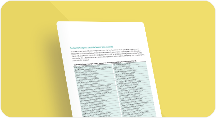Section 8: Company subsidiaries and joint ventures In accordance with Section 409 of the Companies Act 2006, a full list of subsidiaries and equity accounted investments as at 31 December 2025 is disclosed below. Unless otherwise stated, the Group’s ownership interest represents 100% of the ordinary shares, units or partnership capital held indirectly by Unite Group PLC. No subsidiary undertakings have been excluded from the consolidation. The Unite Foundation has a year-end of 30 September to facilitate academic year reporting. All other subsidiaries have a year-end of 31 December. Registered office and principal place of business: 1st Floor, Welcome Building, Avon Street, Bristol, BS2 0PS Filbert Village GP Limited (06016554) (22.0%)** LDC (Hillhead) Limited (06176554)** Filbert Village Student Accommodation Limited Partnership (29.8%)**, dissolved in 2025 LDC (Holdings) Limited (02625007)* LDC (180 Stratford) Limited (14254727)** LDC (Imperial Wharf) Limited (04541678)** LDC (AIB Warehouse) Limited (04872419)** LDC (International House) Limited (10131352)** LDC (Alscot Road) Limited (06176428)** LDC (Kelham Island) Limited (05152229)** LDC (Brunel House) Limited (09760628)** LDC (Leasehold A) Limited (04066933)** LDC (Camden Court Leasehold) Limited (05140620)** LDC (Leasehold B) Limited (05978242)** LDC (Camden Court) Limited (05082671)** LDC (Loughborough) Limited (04207522)** LDC (Capital Cities Nominee No.1) Limited (05347228) (50.0%)** LDC (Magnet Court Leasehold) Limited (05140255)** LDC (Capital Cities Nominee No.2) Limited (05359457) (50.0%)** LDC (Millennium View) Limited (09890375)** LDC (Capital Cities Nominee No.3) Limited (08792780) (50.0%)** LDC (MTF Portfolio) Limited (05530557)** LDC (Capital Cities Nominee No.4) Limited (08792688) (50.0%)** LDC (Nairn Street) GP1 Limited (07580262) (22.0%)** LDC (Capital Cities) Limited (05347220) (50.0%)** LDC (Nairn Street) GP2 Limited (07580257) (22.0%)** LDC (Causewayend) Limited (08895966)** LDC (Nairn Street) GP3 Limited (07808933)** LDC (Chantry Court Leasehold) Limited (05140258)** LDC (Nairn Street) GP4 Limited (07808919)** LDC (Chaucer House) Limited (09898020)** LDC (Nairn Street) Holdings Limited (07579402)** LDC (Constitution Street) Limited (09210998)** LDC (Nairn Street) Limited Partnership (29.8%)** LDC (Construction Two) Limited (04847268)** LDC (Nairn Street) Management Limited Partnership (29.8%) LDC (Euro Loan) Limited (06623603)** LDC (New Wakefield Street) Limited (10436455)** LDC (Ferry Lane 2) GP1 Limited (07359448) (50.0%)** LDC (Newgate) Limited (08895869)** LDC (Ferry Lane 2) GP2 Limited (07359481) (50.0%)** LDC (Old Hospital) Limited (09702143)** LDC (Ferry Lane 2) GP3 Limited (07503842)** LDC (Oxford Road Bournemouth) Limited (04407309)** LDC (Ferry Lane 2) GP4 Limited (07503913)** LDC (Portfolio 100) Limited (07989369)** LDC (Ferry Lane 2) Holdings Limited (07504099) (50.0%)** LDC (Portfolio 20) Limited (08803996)** LDC (Ferry Lane 2) Limited Partnership (50.00%)** LDC (Portfolio Five) Limited (06079581)** LDC (Ferry Lane 2) Management Limited Partnership (50.00%)** LDC (Portfolio Four) Limited (04985603)** LDC (Finance) Limited (09760806)** LDC (Portfolio One) Limited (03005262)** LDC (Greetham Street) Limited (08895825)** LDC (Portfolio) Limited (08419375)** LDC (Gt Suffolk St) GP1 Limited (07274156)** LDC (Project 110) Limited (05083580)** LDC (Gt Suffolk St) GP2 Limited (07274000)** LDC (Project 111) Limited (05791650)** LDC (Gt Suffolk St) Holdings Limited (07353946)** LDC (Radmarsh Road) Limited (05435290)** LDC (Gt Suffolk St) Limited Partnership** LDC (Skelhorne) Limited (09898132)** LDC (Gt Suffolk St) Management GP1 Limited (07354719)** LDC (Smithfield) Limited (03373096)** LDC (Gt Suffolk St) Management GP2 Limited (07354728)** LDC (St Leonards) Limited (08895830)** LDC (Gt Suffolk St) Management Limited Partnership** LDC (St Pancras Way) GP1 Limited (07359501)** LDC (Hampton Street) Limited (06415998)** LDC (St Pancras Way) GP2 Limited (07359428)** * Held directly by the Company. ** Company is exempt from the requirements of the Companies Act relating to the audit of individual financial statements by virtue of s477 or s479A for the financial year ended 31 December 2025. THE UNITE GROUP PLC Annual Report and Accounts 2025 197